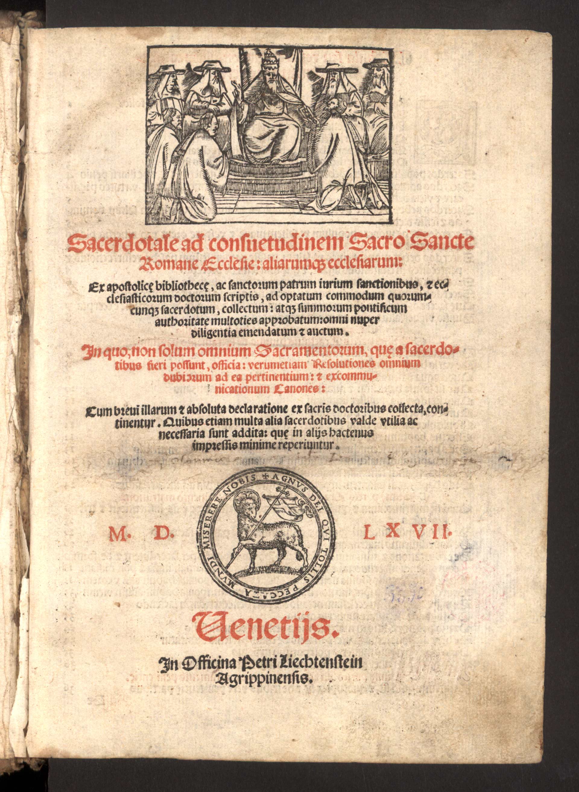 Aa-2-02) Titulní list knihy, označované obvykle jako agenda či rituál obsahující různé typy obřadů, byla vytištěna v Benátkách v dílně Petra Liechtensteina roku 1567.