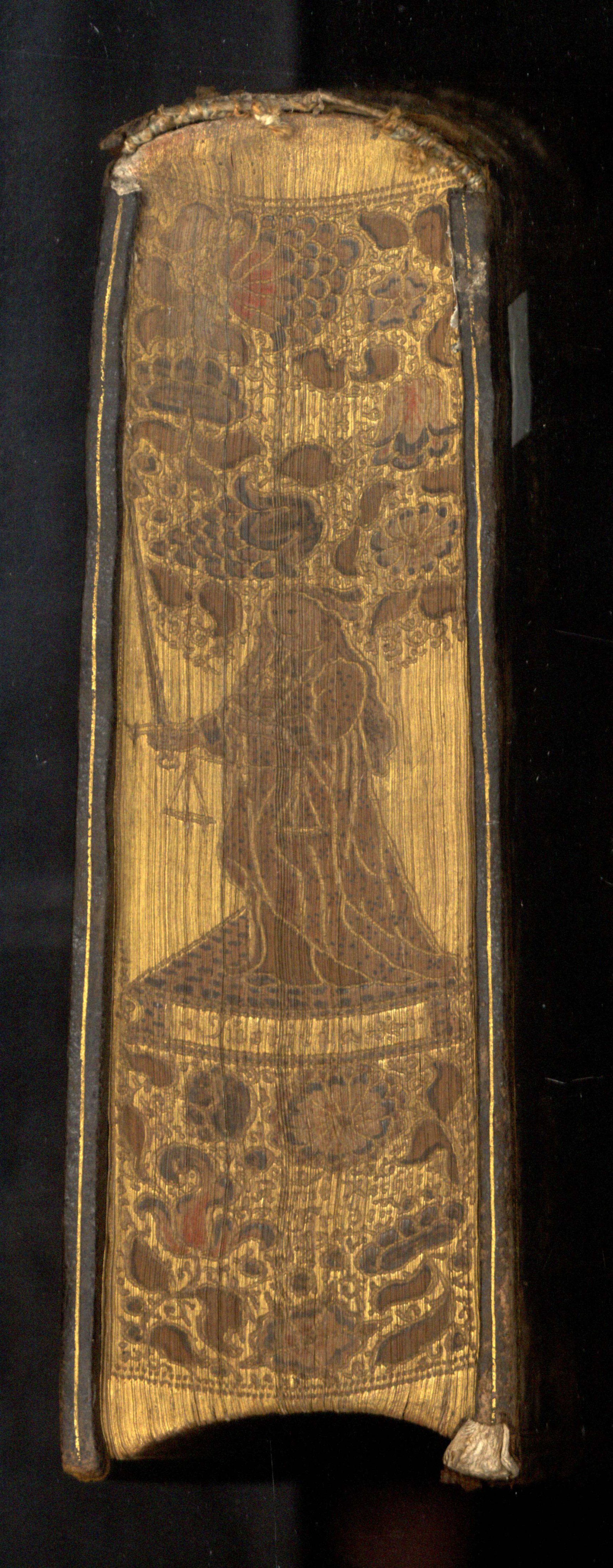 Ca-3-04) Horní ořízka je zlacená, cizelovaná a malovaná (možná poněkud zašlá prachem). Představuje alegorii Spravedlnosti.