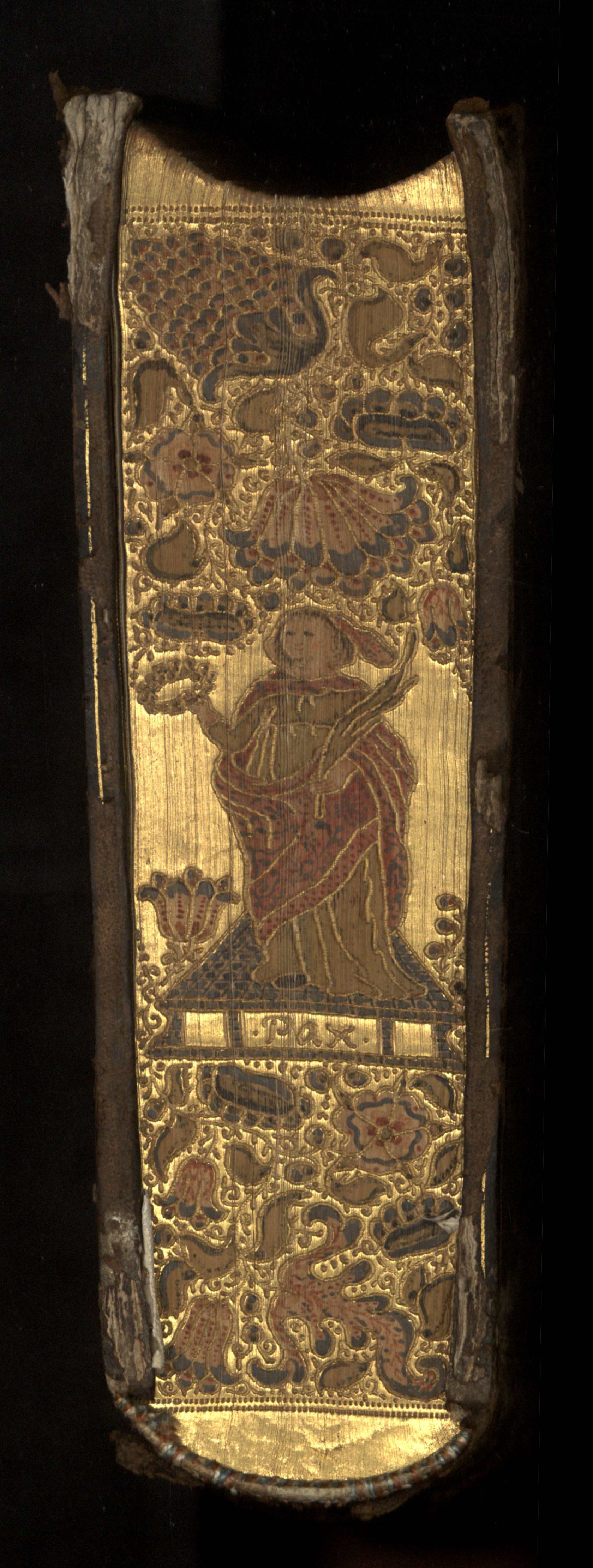 Ca-3-05) Dolní ořízka je zlacená, cizelovaná a malovaná. Představuje alegorii Míru.