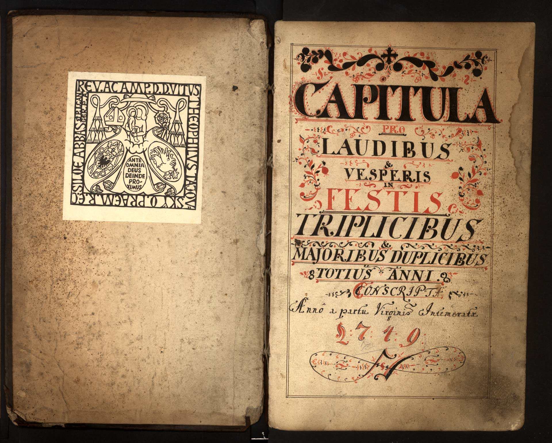 Ca-4-01) Na předním přídeští rukopisu z roku 1749 je nalepeno erbovní exlibris opata Víta Tajovského. Rukopis obsahuje čtení pro ranní chvály a nešpory na všechny významné svátky církevního roku.