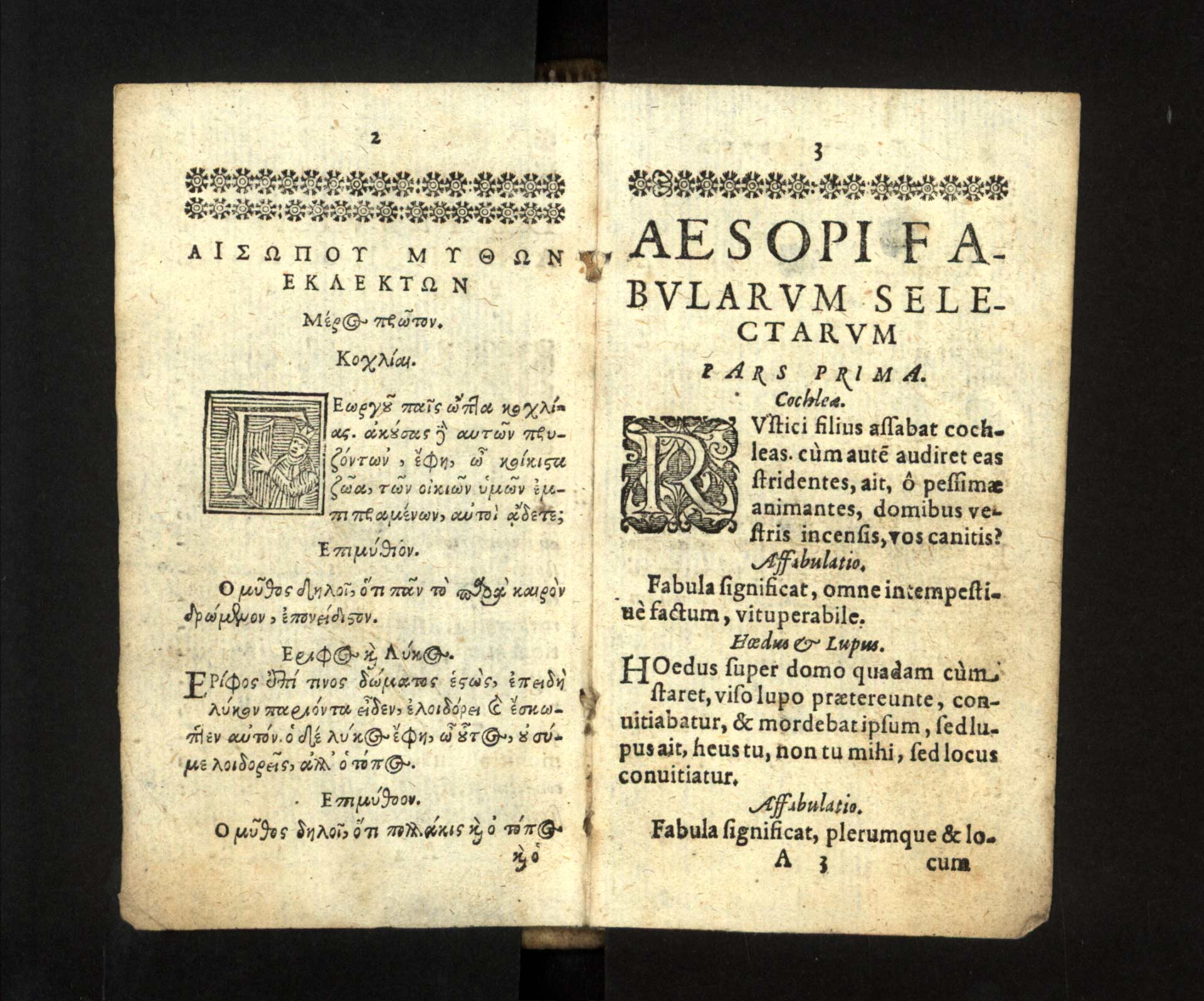Cb-3-02) Ukázka řecko-latinského tisku Ezopových bajek, uvozená vlysem z tiskařských ozdůbek a provázená dřevořezovými iniciálami.