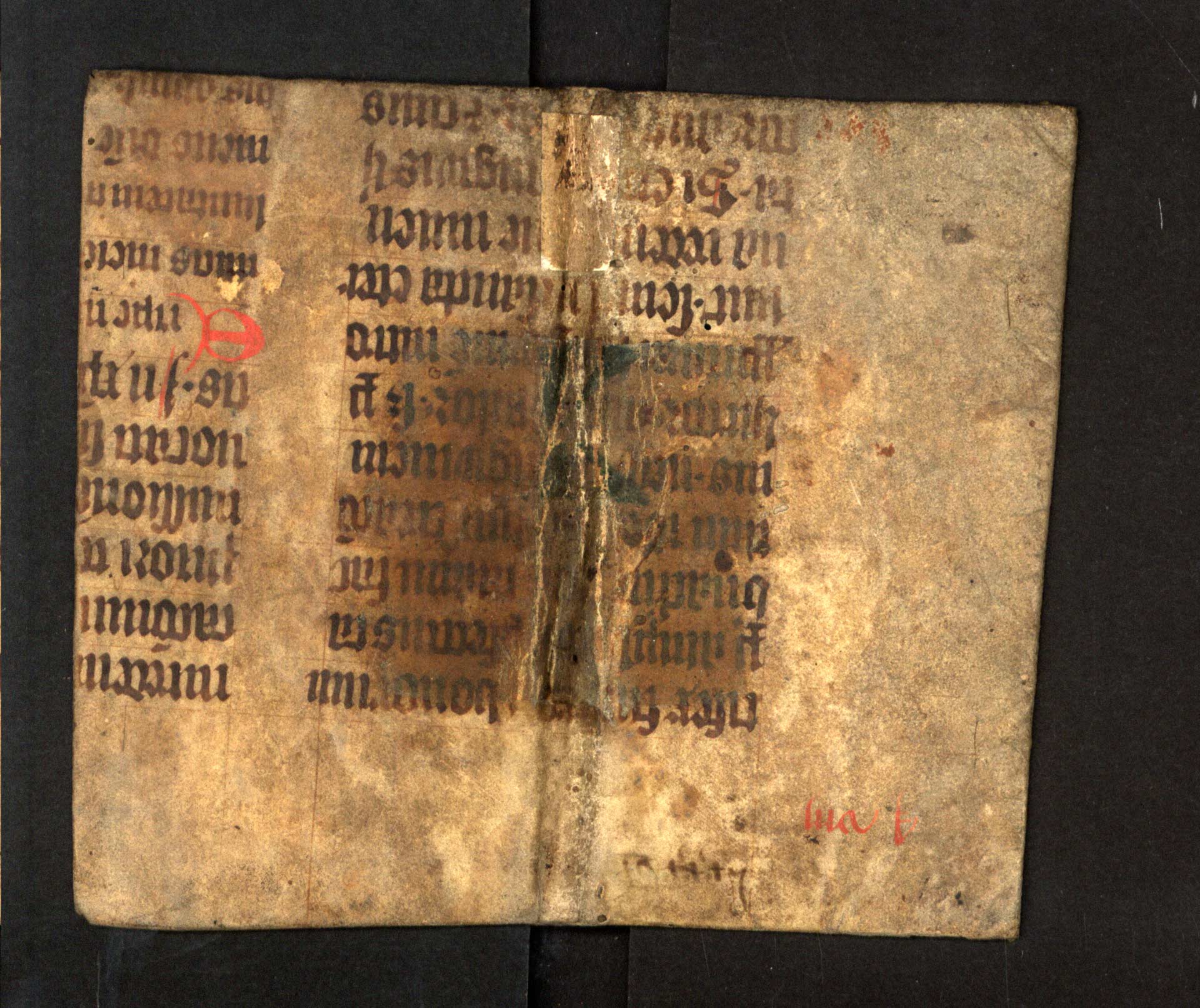 Cb-3-03) Desky a hřbet knihy jsou potaženy sekundárně použitým pergamenem, popsaným gotickou minuskulou.
