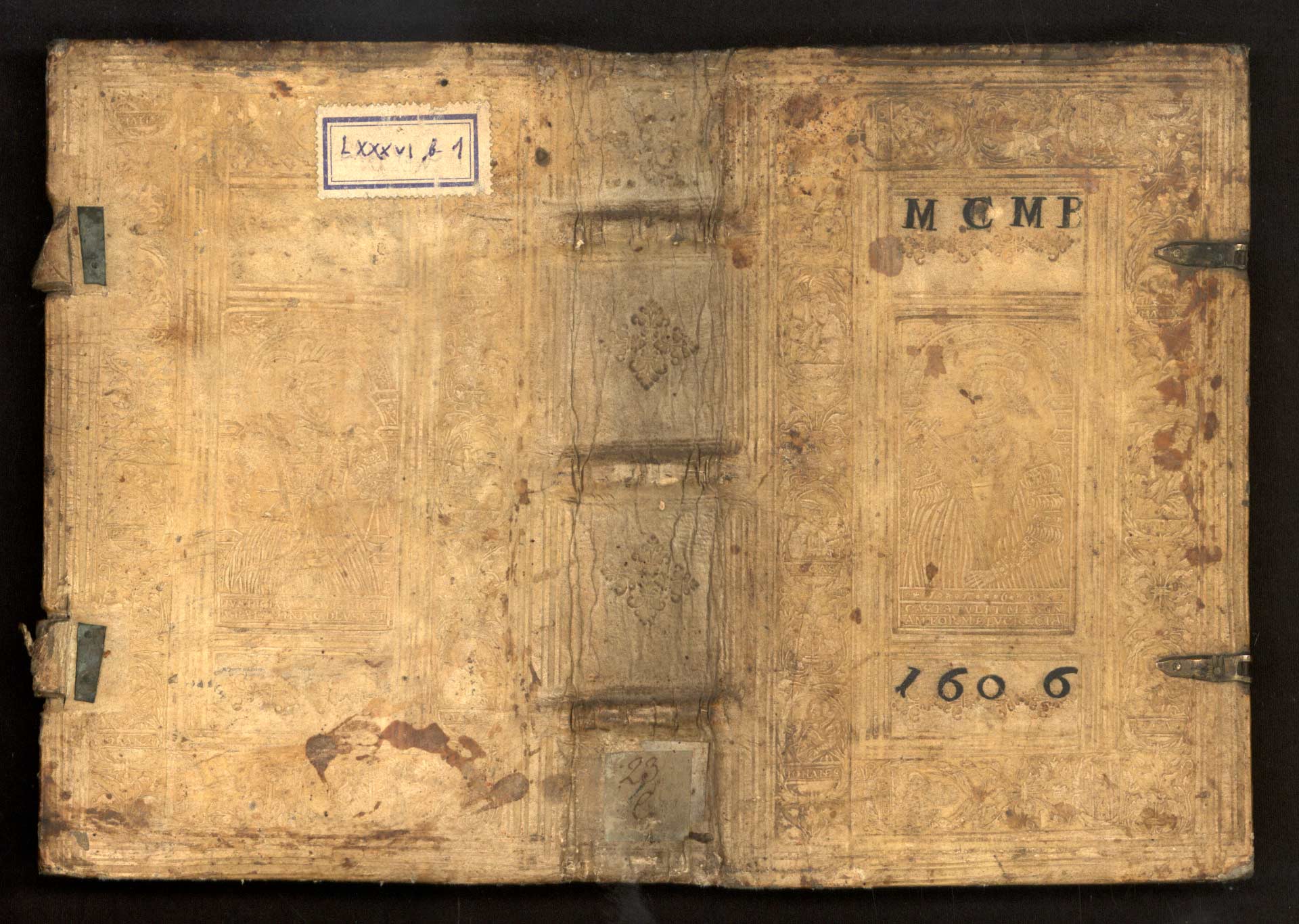 Cc-2-01) Renesanční vazba se slepotiskovou rámovou kompozicí nese na přední desce supralibros s iniciálami "M. C. M. P." a vročením "1606".