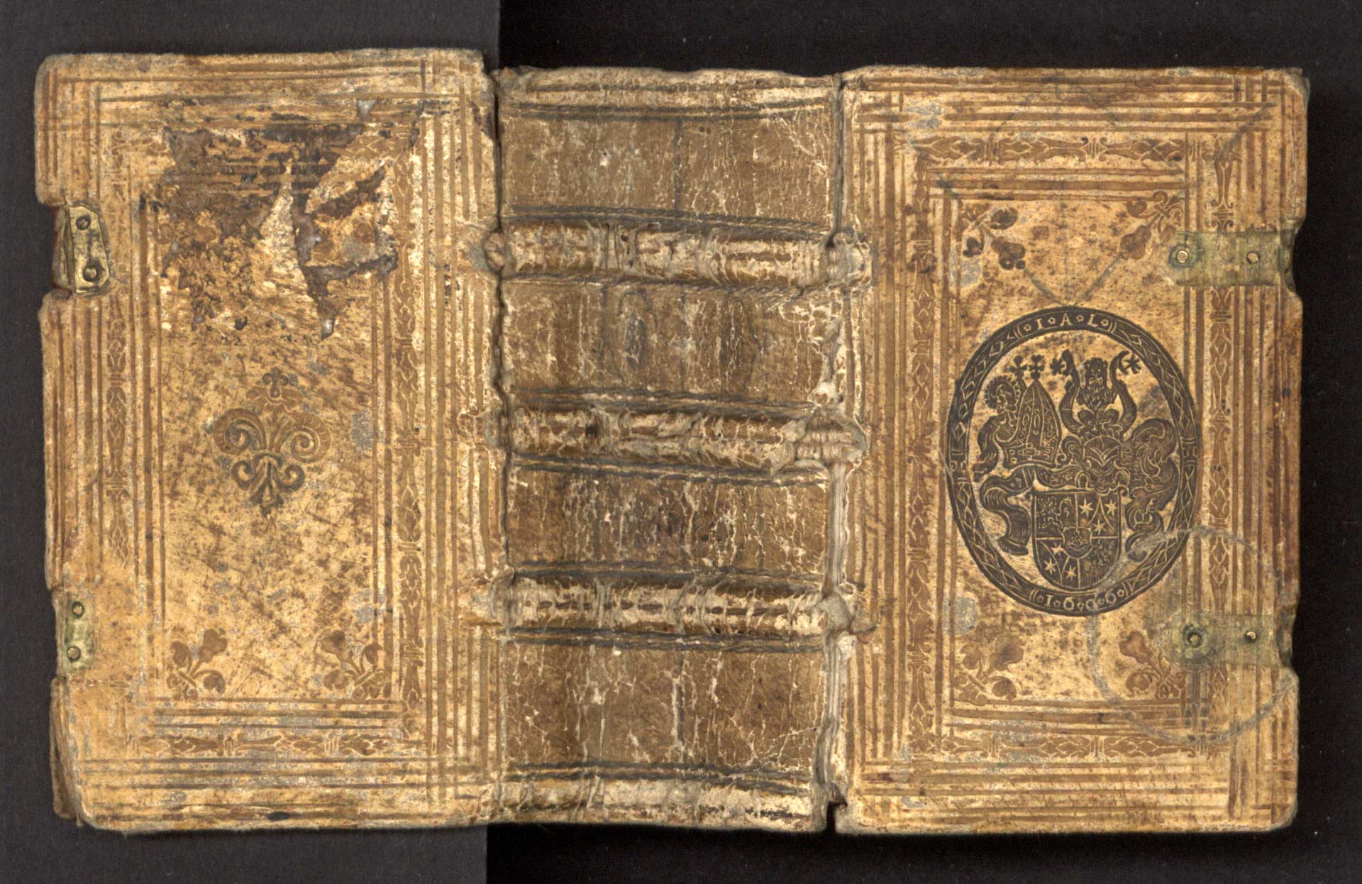Cc-3-01) Vazba ze světlé kůže zdobené slepotiskem nese na přední desce erbovní supralibros blíže neznámého vlastníka s iniciálami "I. A. L." a letopočtem "1606".