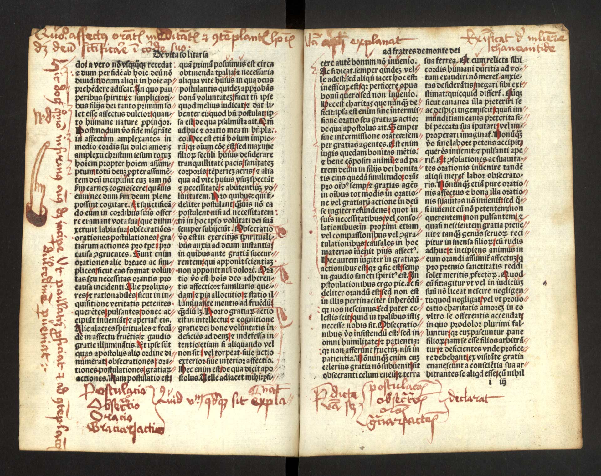 Aa-1-06) Rukopis je opatřen celou řadou dopsaných poznámek v gotické polokursivě. Vlevo vidíme odkazovací ručku upozorňující na zvláště důležitý text.