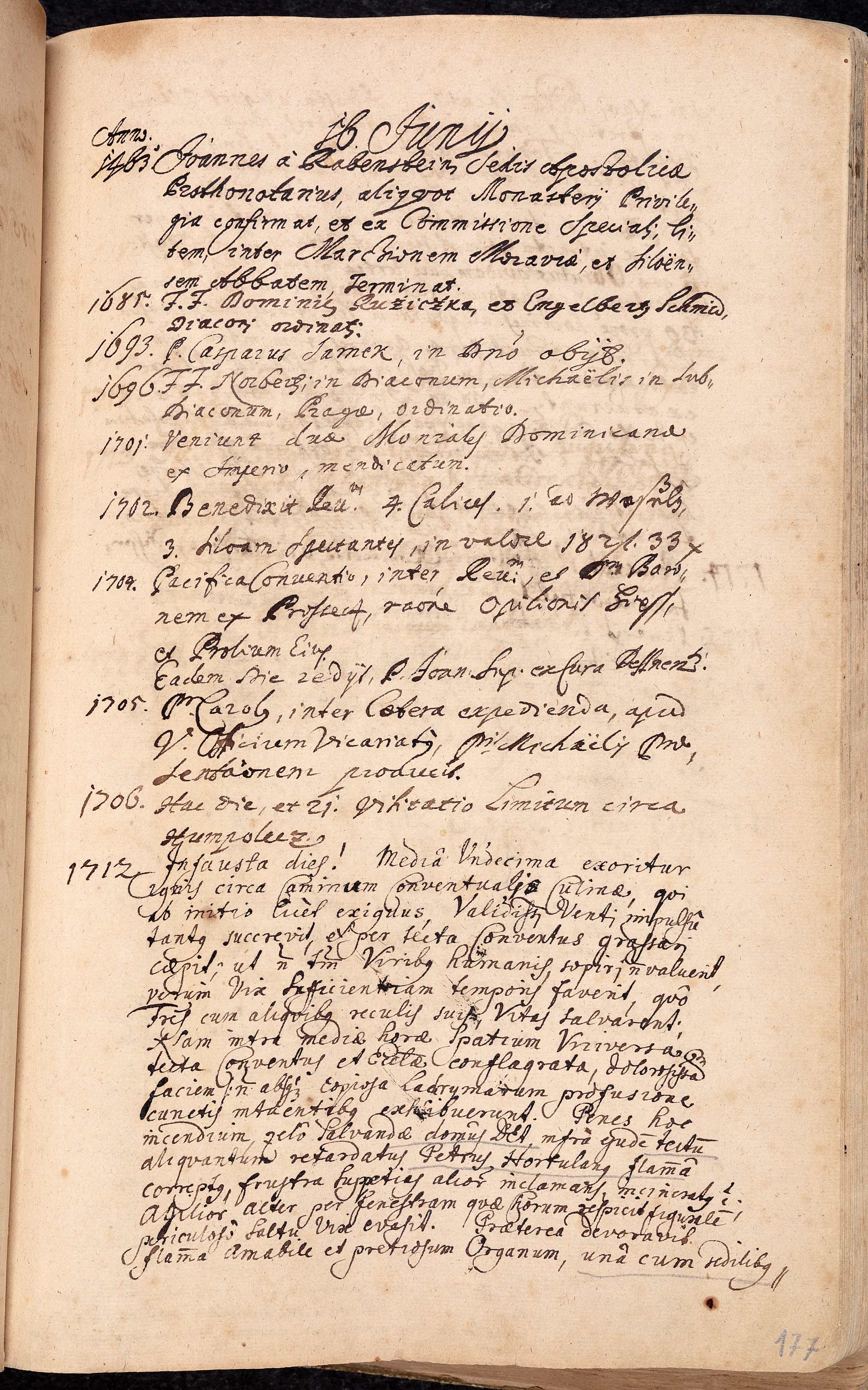 Da-1-16) První strana událostí zaznamenaných k 16. červenci. K roku 1712 zachycen velký požár kláštera, který inicioval barokní přestavbu areálu.