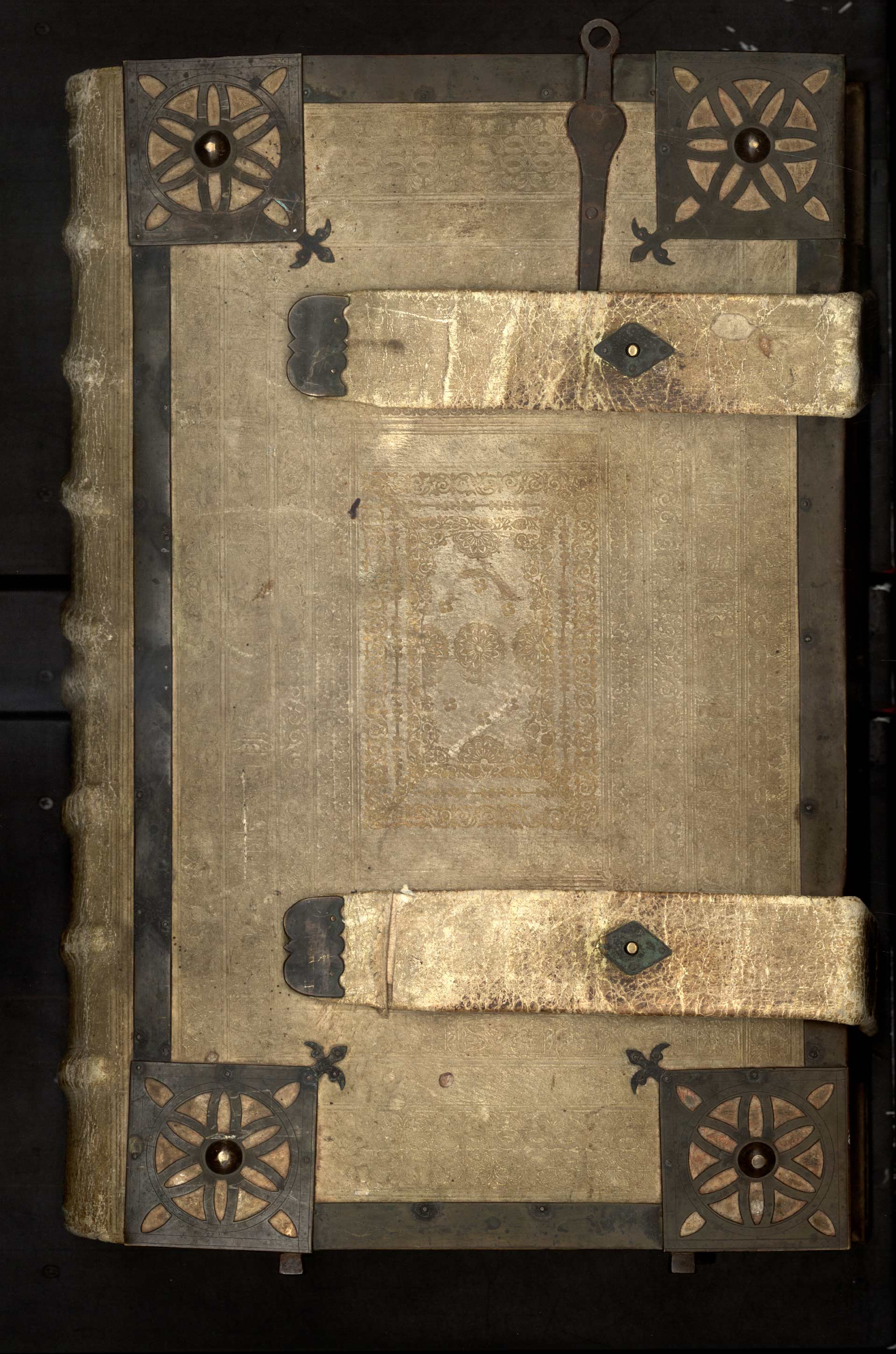 Aa-3-01) Přední deska antifonáře je opatřena světlou kůží zdobenou slepotiskem i zlatým tiskem. Rohy jsou chráněny čtvercovými nárožnicemi s puklami. Hrany desek jsou okovány a na dolní straně obsahují i malé výstupky, které měly zabránit opotřebování listů. Kniha je uzavřena na dvě dírkové spony.