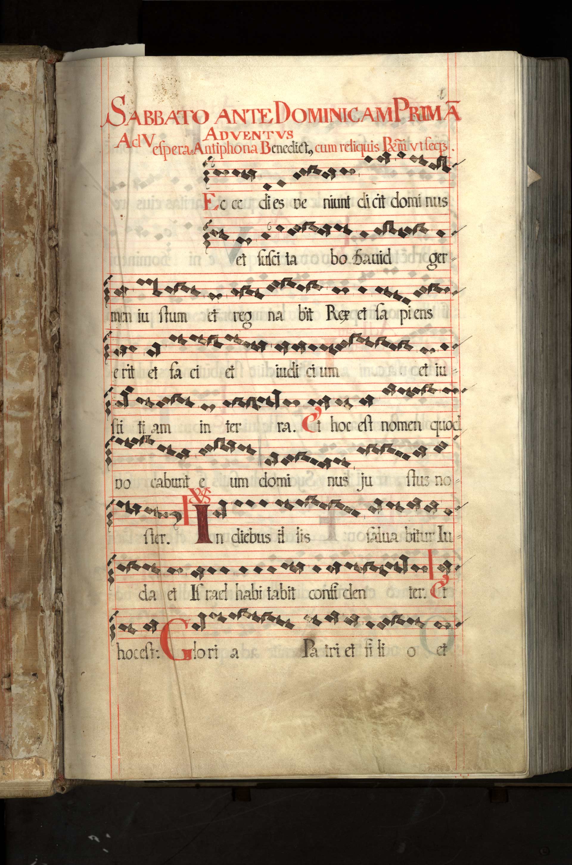 Aa-3-04) Rukopis opsal v roce 1659 pro spolubratry, odcházející obnovit řeholní život v Želivě, nejstarší člen strahovské komunity Arnošt Kokius. První strana přináší antifony k nešporám první neděle adventní.