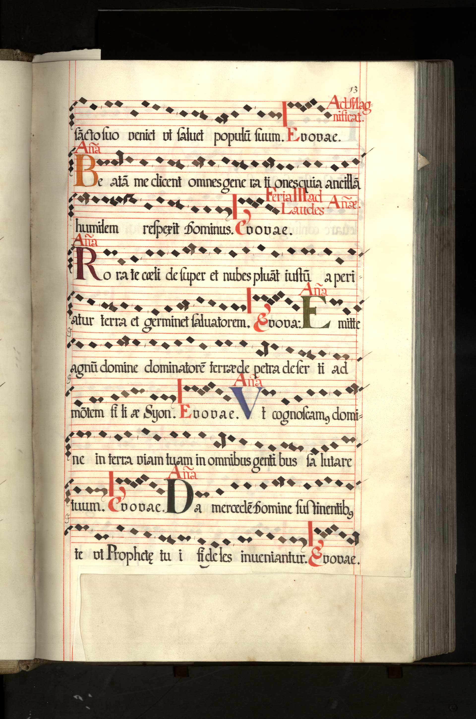 Aa-3-05) V souladu se svým posláním je antifonář psán humanistickou minuskulou a opatřen chorální notací.