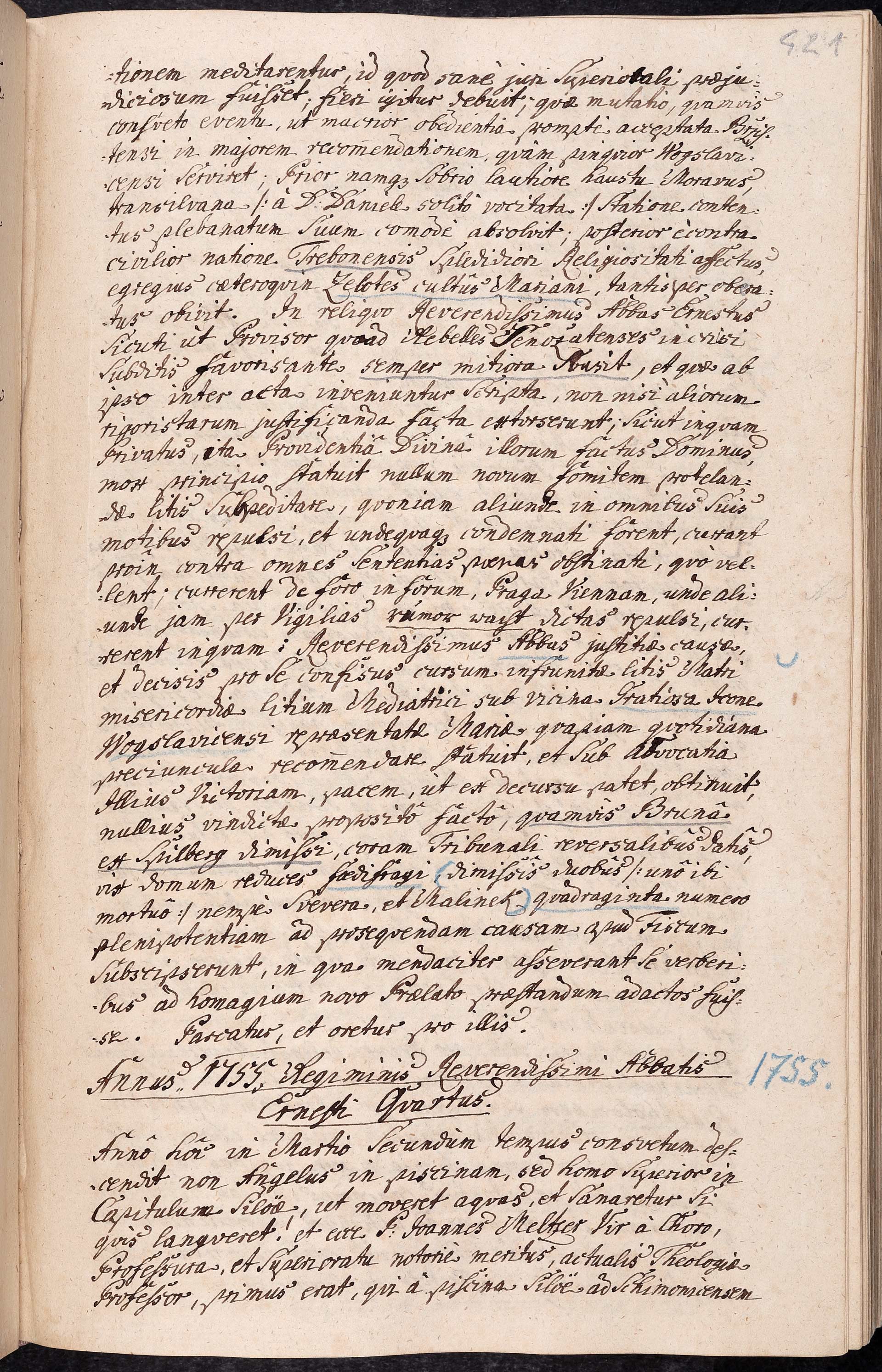 Da-4-19) Devatenáctá strana obsahující pokračování líčení prvních dvou let opatského působení Arnošta Morávka. Na konci strany začínají zápisy k roku 1775.