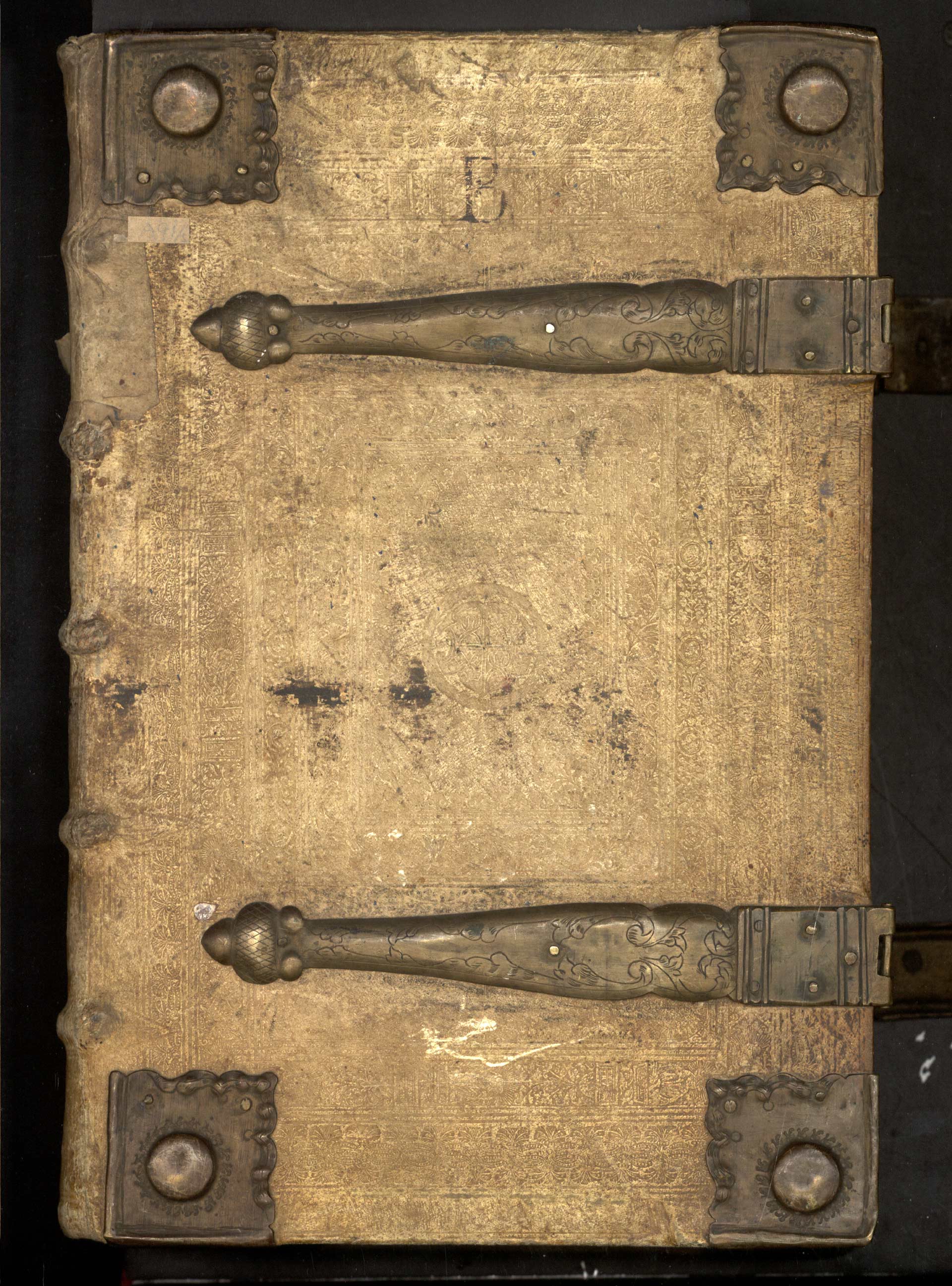 Aa-4-01) Vazba ze světlé kůže zdobené slepotiskem je opatřena čtvercovými nárožnicemi se zakomponovanými puklami a dvojicí háčkových spon.