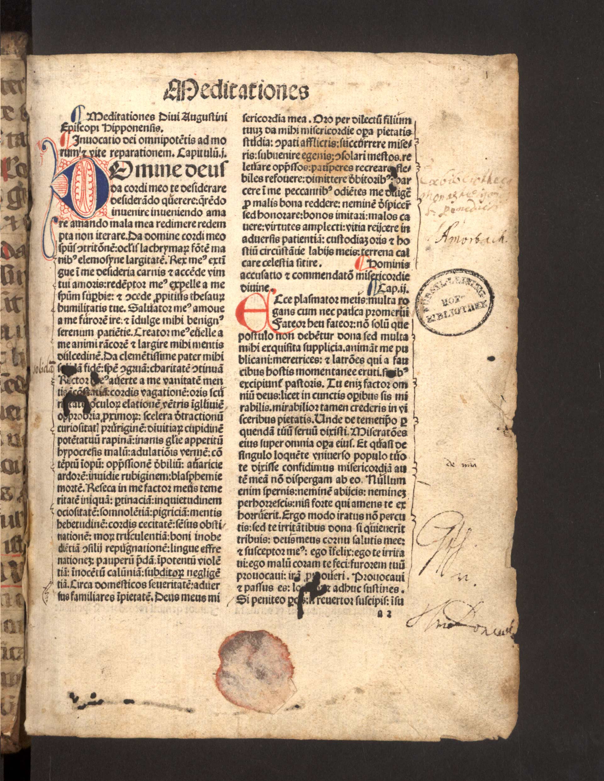Ab-2-03) Na prvním listu kromě tištěného textu nalezeneme i ručně domalovávané inicálky a také vlastnickou poznámku prozrazující, že kniha patřila benediktinskému lášteru v Amorbachu.