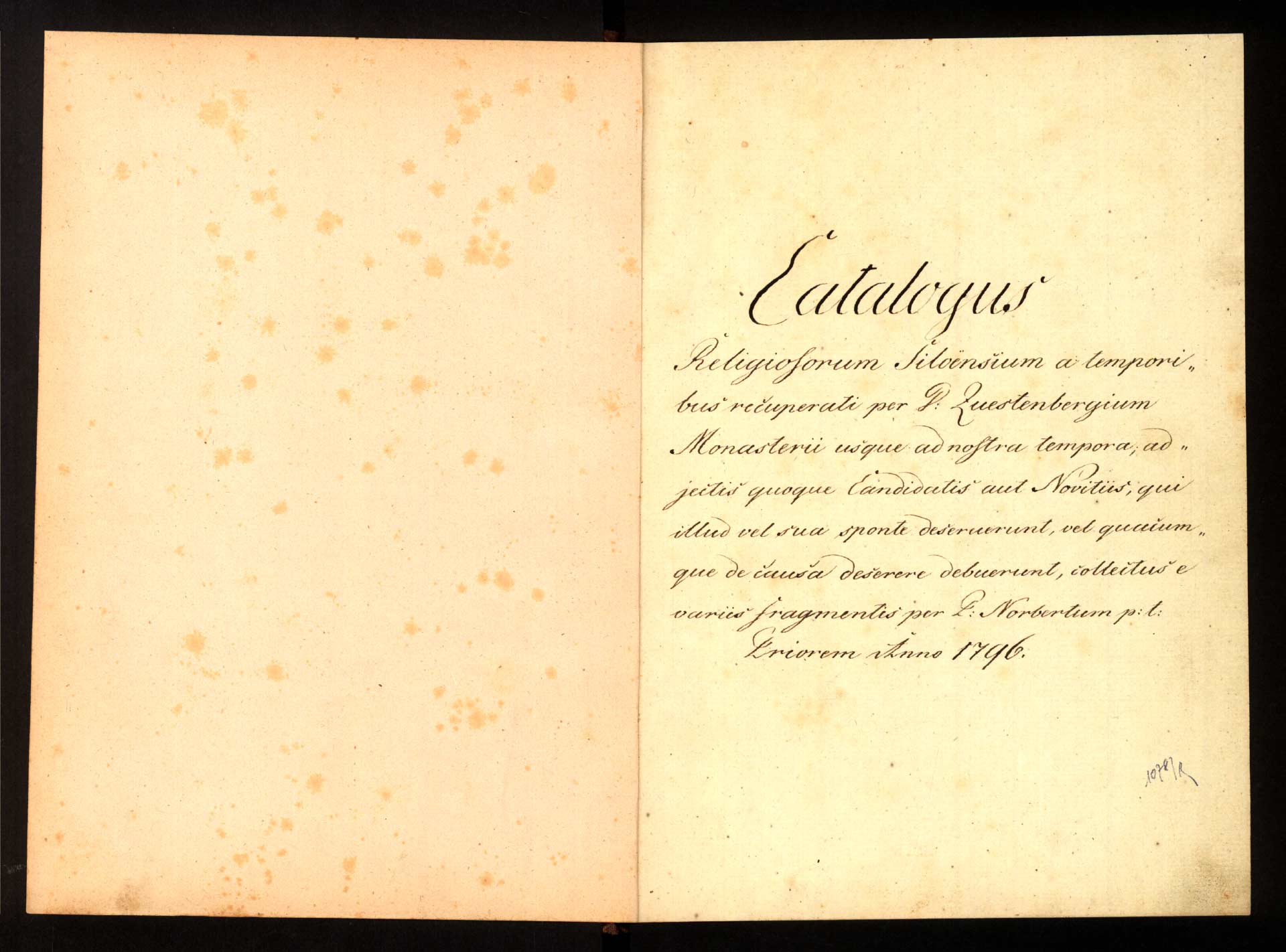 Da-6-01) Titulní list katalogu želivských premonstrátů od obnovení kanonie po třicetileté válce, založený převorem Norbertem Schmischowským v roce 1796.