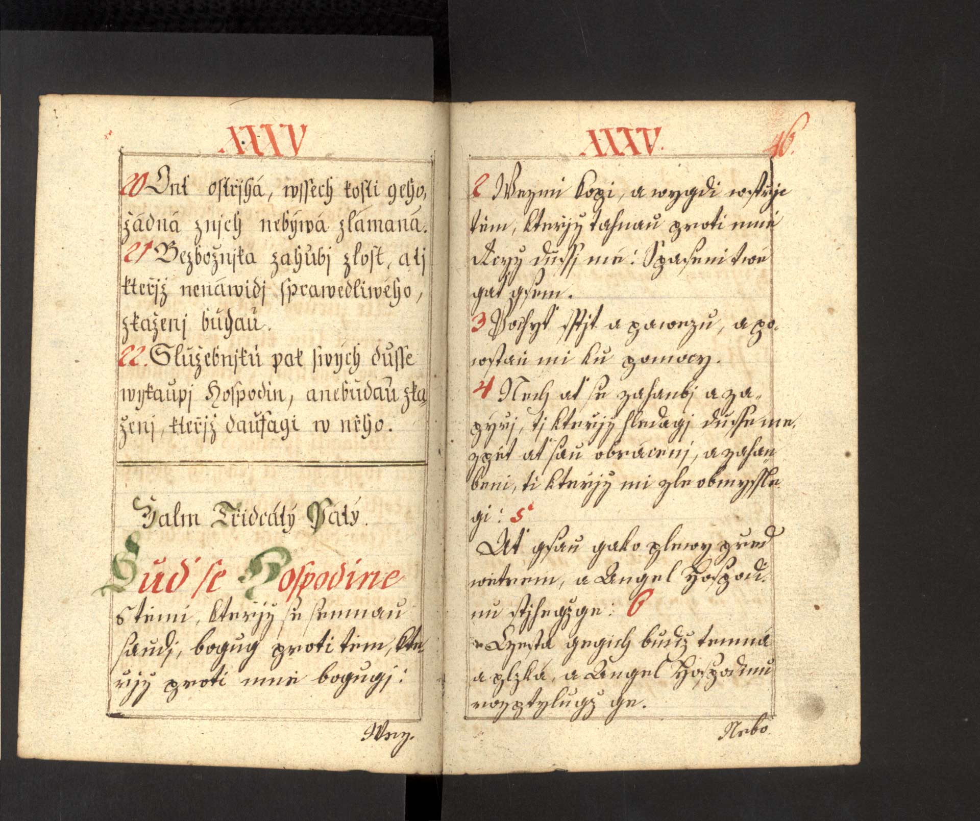 Ea-3-03) Jednotlivé žalmy jsou zapsány různými typy novogotického písma, počínaje kresleným písmem a konče kursivou.