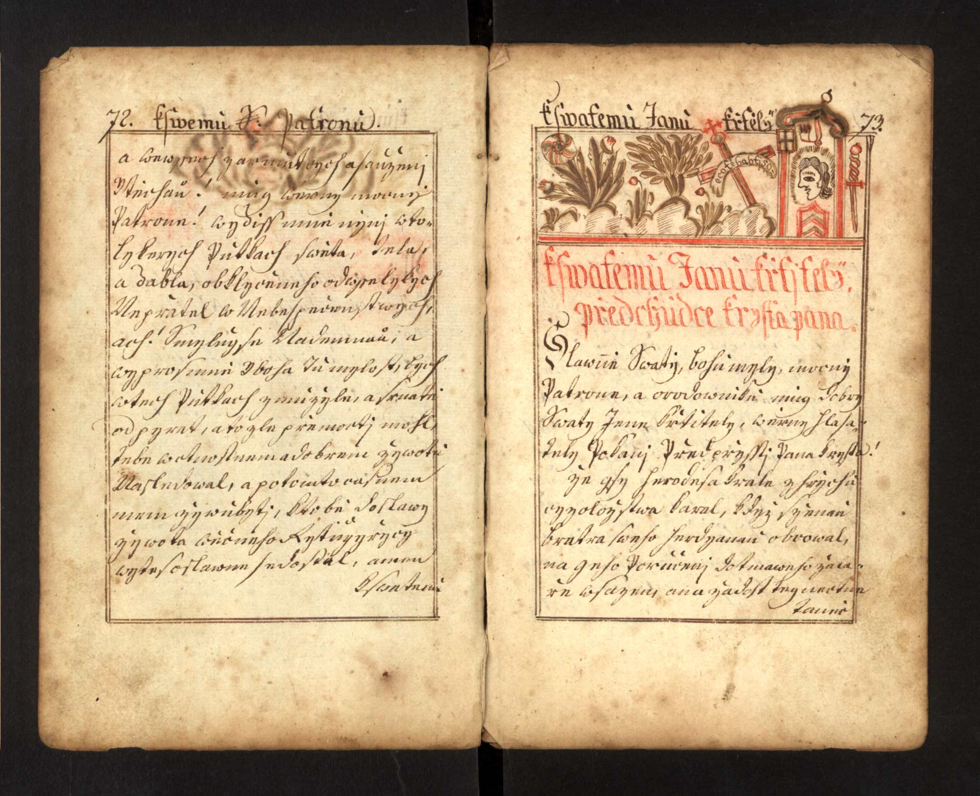 Ea-4-04) Závěr knihy patří modlitbám ke svatým. Modlitbu k Janu Křtiteli uvozuje postava uvězněného Jana provázená vlevo motivem kříže s nápisem "eco te babtizo", vpravo je pak meč, jímž byl Jan sťat.