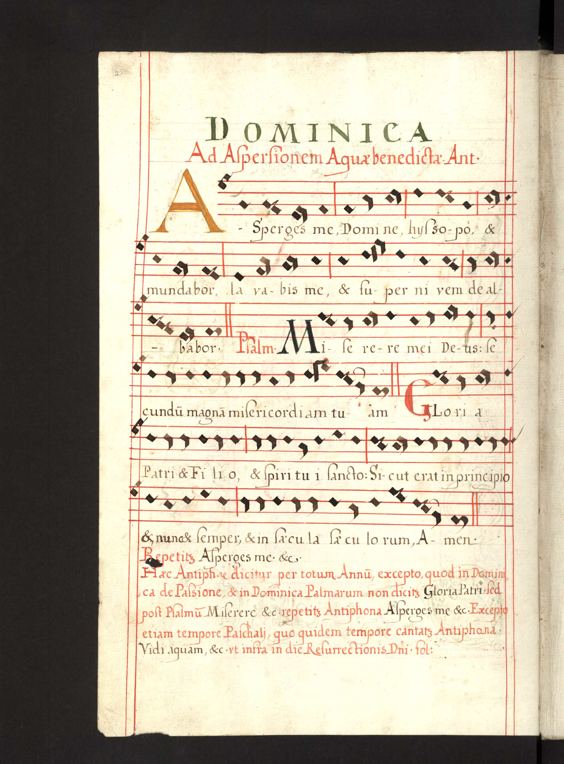 Aa-4-04) Zpěv k obřadům kropení svěcenou vodou ("asperges"). Je zachycen chorální notací a zapsán humanistickou minuskulou.