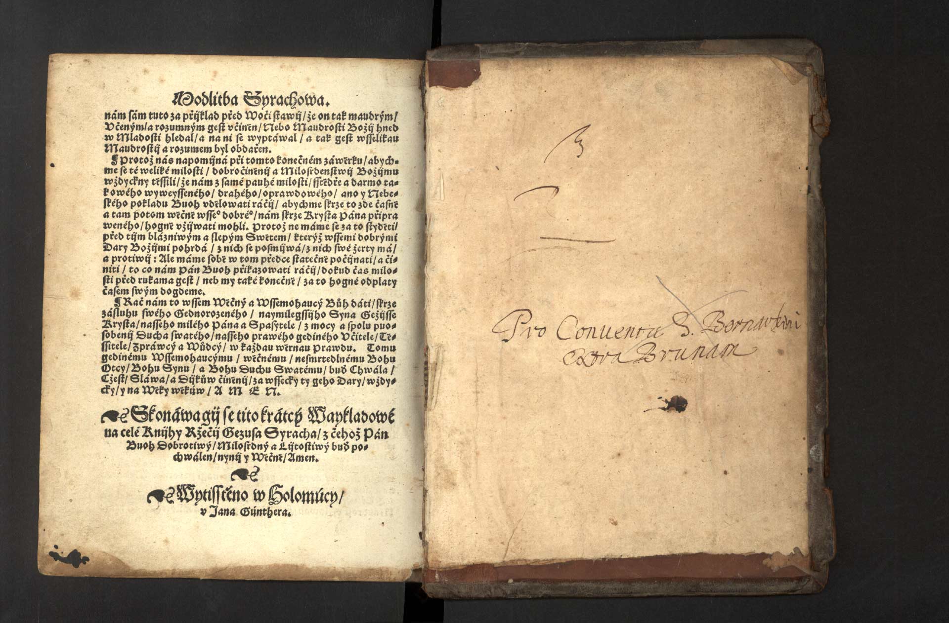 Ab-3-04) Na poslední straně se dozvídáme, že knihu v Olomouci roku 1563 vytiskl Jan Günther. Na zadním přídeští je opět vlastnická poznámka brněnských františkánů.