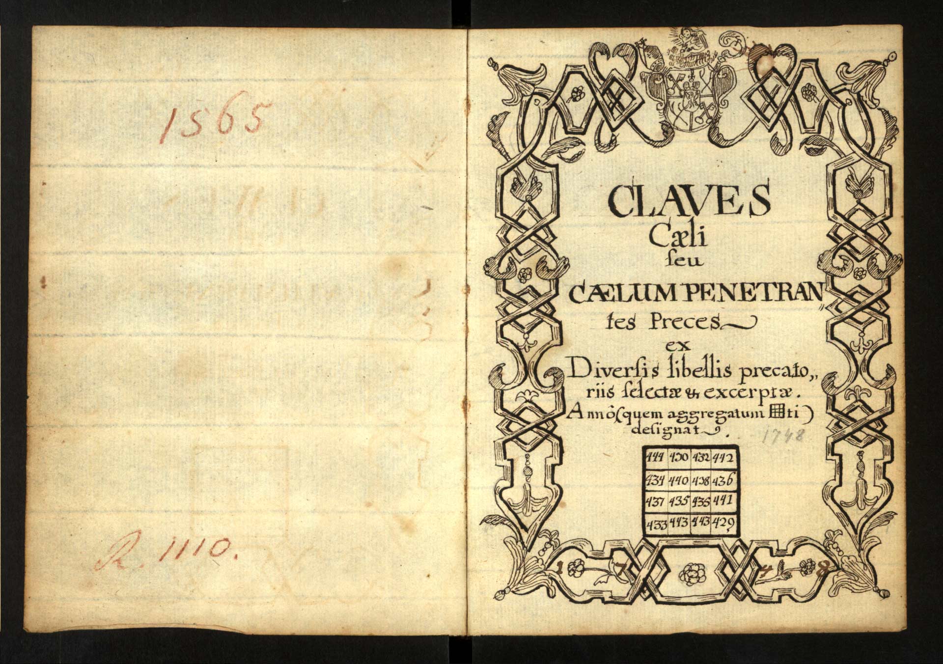 Fa-2-01) Kniha latinských modliteb nazvaná "Claves caeli seu caelum penetrantes preces" byla napsána v roce 1748 v želivském klášteře. Svědčí o tom titulní list zdobený v horní části bordury již polepšeným erbem kanonie. Dataci určuje matematická hříčka v dolní části listu.