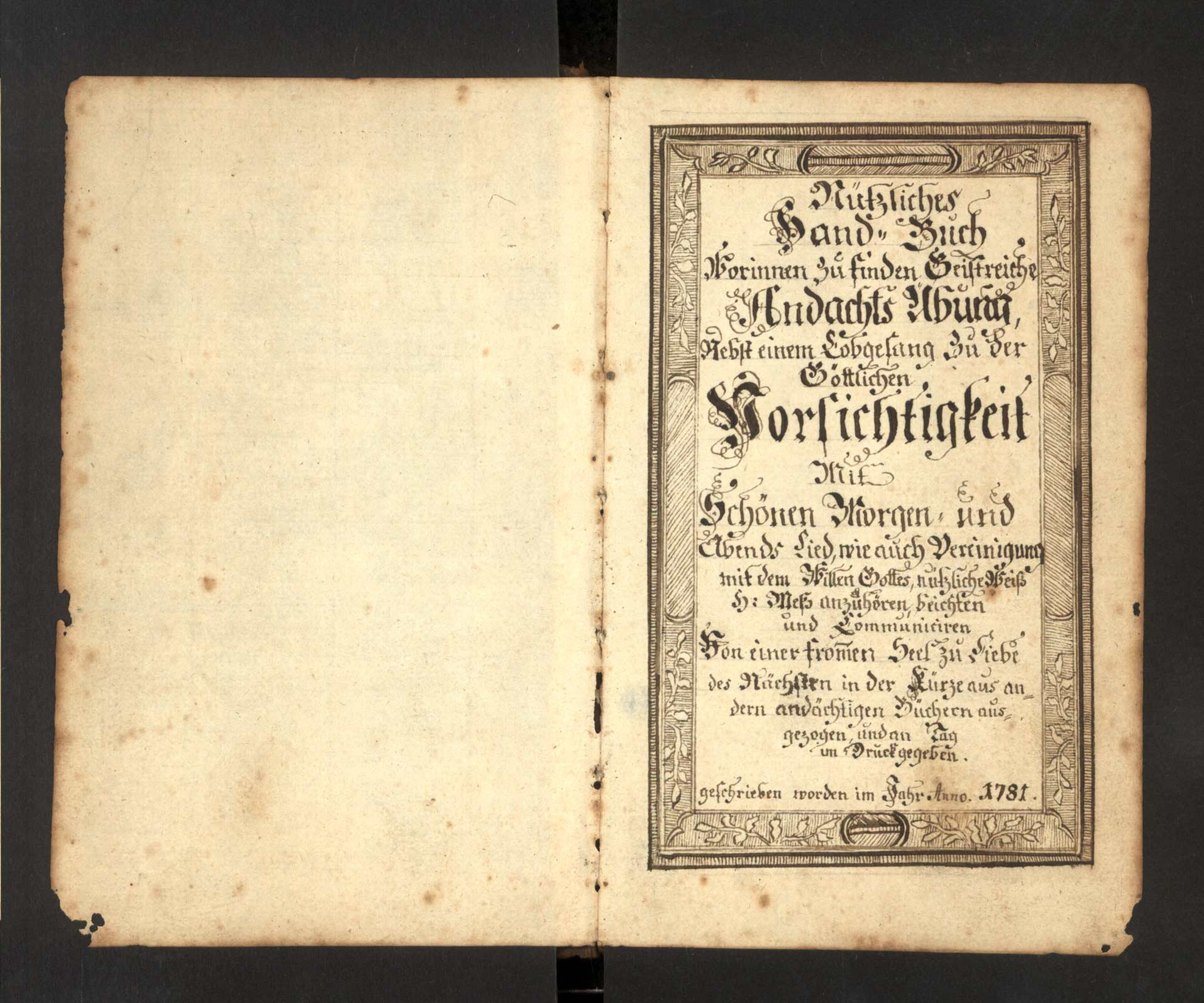 Fa-3-01) Německá modlitební kniha pocházející z lidového prostředí byla opsána roku 1781. Pro titulní list je použito novogotické kreslené písmo a okraje jsou lemovány perokresebnou bordurou.
