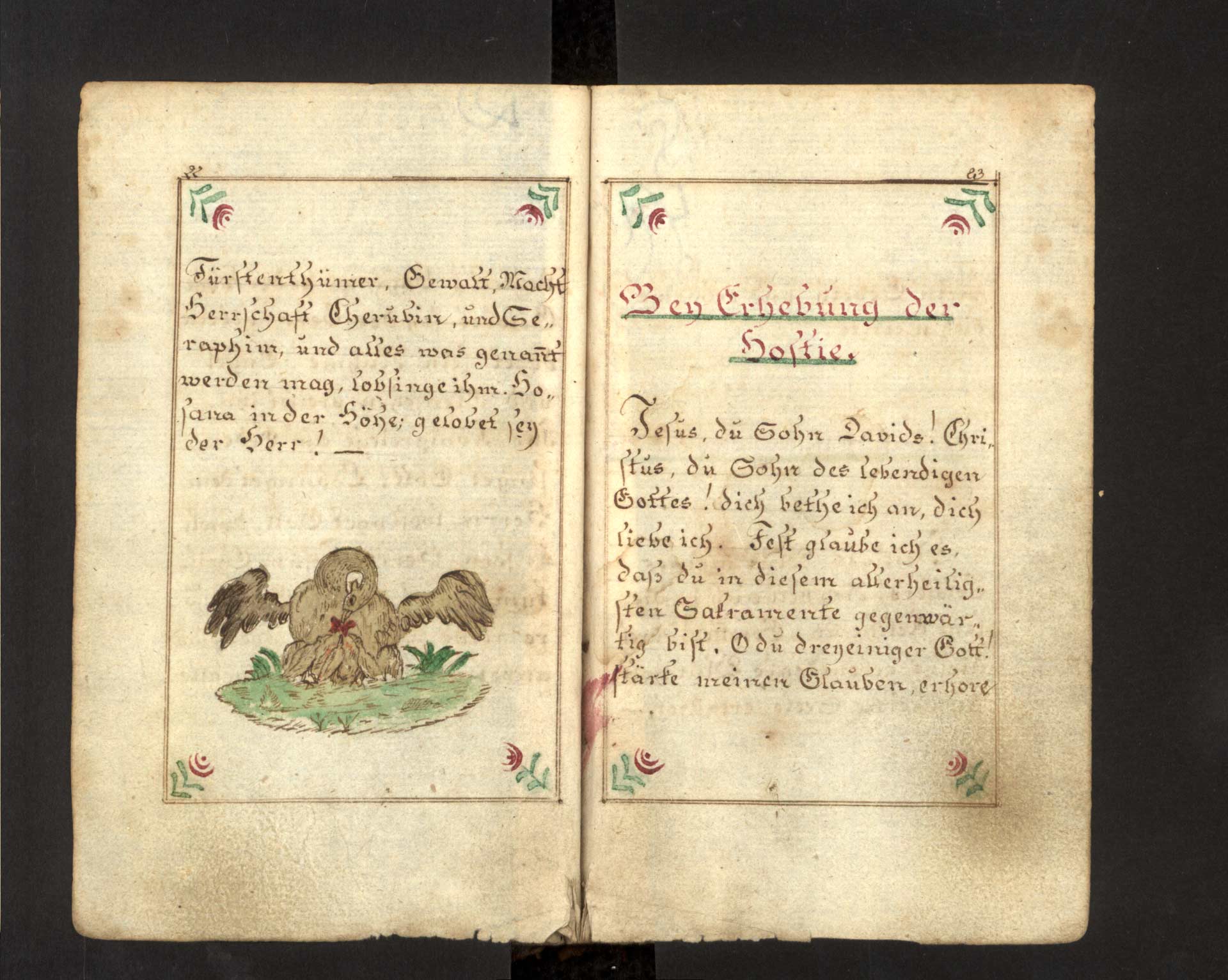 Fa-4-03) Perokresby na koncích stran jsou inspirovány i staršími motivy, zde pelikán krmící vlastní krví svá hladová mláďata (v baroku velmi frekventovaný symbol Krista).