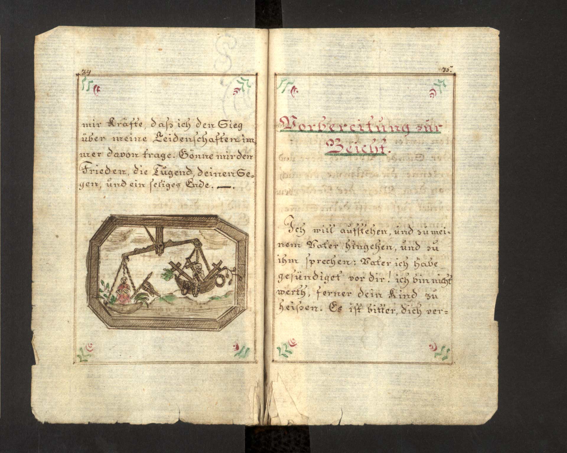Fa-4-04) Modlitby používané pro přípravu na zpověď uvozuje symbolická kresba vah, kde misku s hříchy a marnostmi převažuje miska s kající postavou ženy.