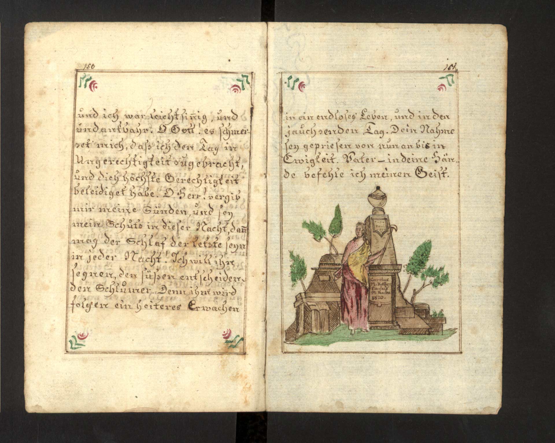 Fa-4-06) Na dobu vzniku rukopisu a jeho tvůrce by mohla ukazovat závěrečná kolorovaná perokresba představující alegorickou postavu ženy na hřbitově. Náhrobek vedle ní nese jména "Carolus M. Katzer", "Paulus M. Kuba" a letopočet "1820".