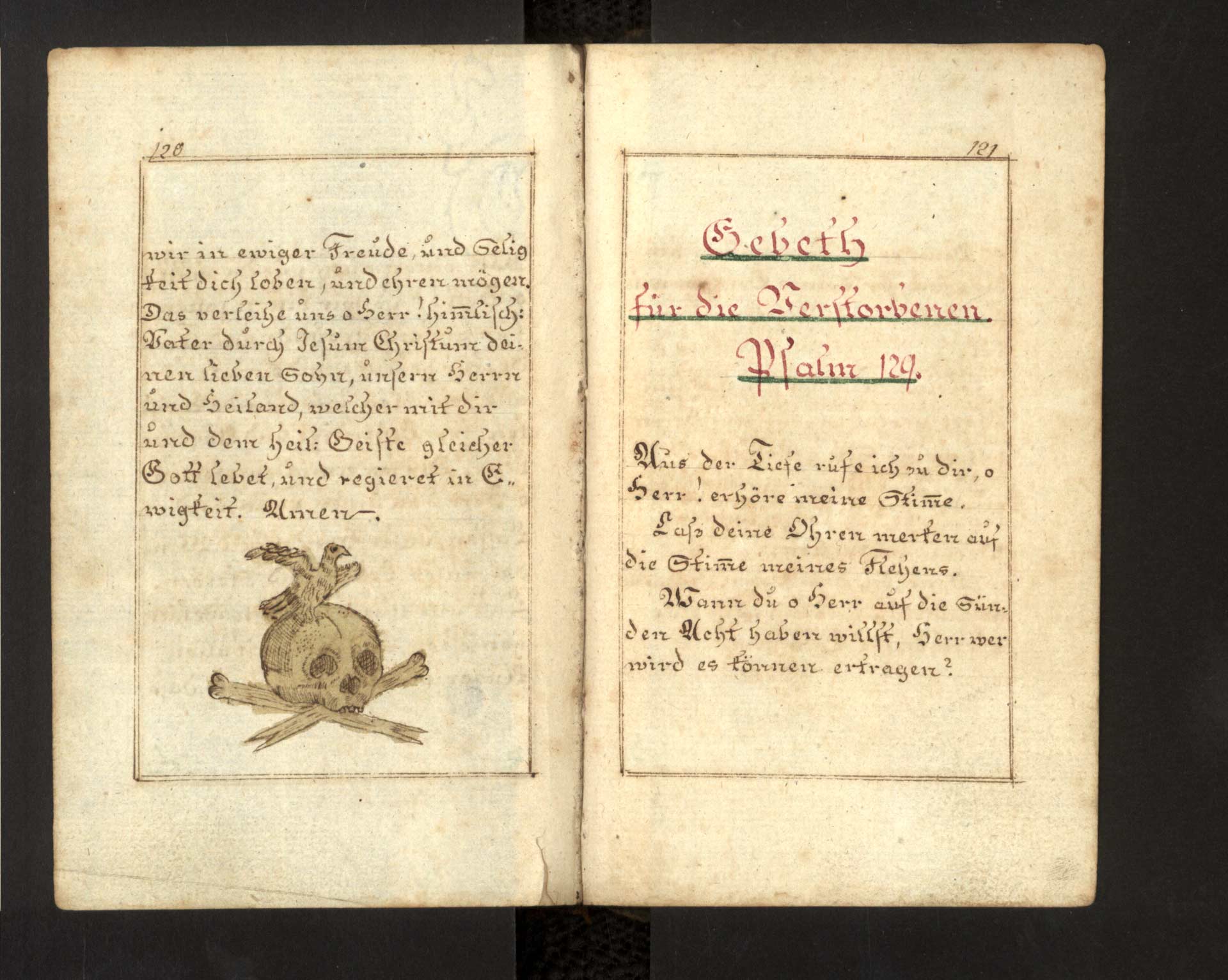 Fa-4-05) Obdobně modlitba za zemřelé je předznamenaná kolorovanou perokresbou lebky se zkříženými hnáty, na níž sedí krkavec.