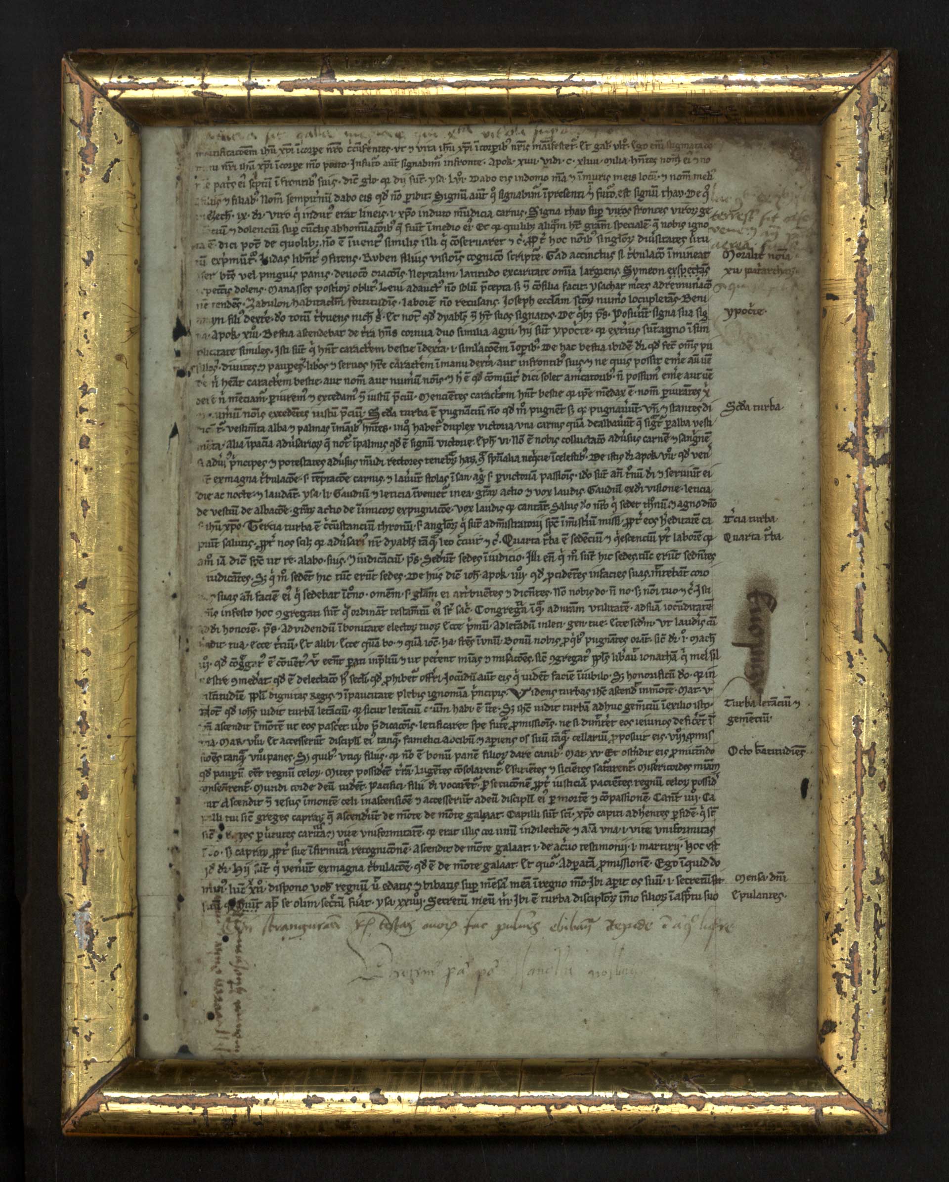 Fb-1-01) Nejstarším dokumentem uchovávaným v želivské klášterní knihovně je list psaný drobnou karolinskou minuskulou pocházející nejspíše z konce 12. století. List byl patrně sňat z vazby knihy a nejpozději v 19. století adjustován do pozlaceného dřevěného rámečku mezi dvě skla.