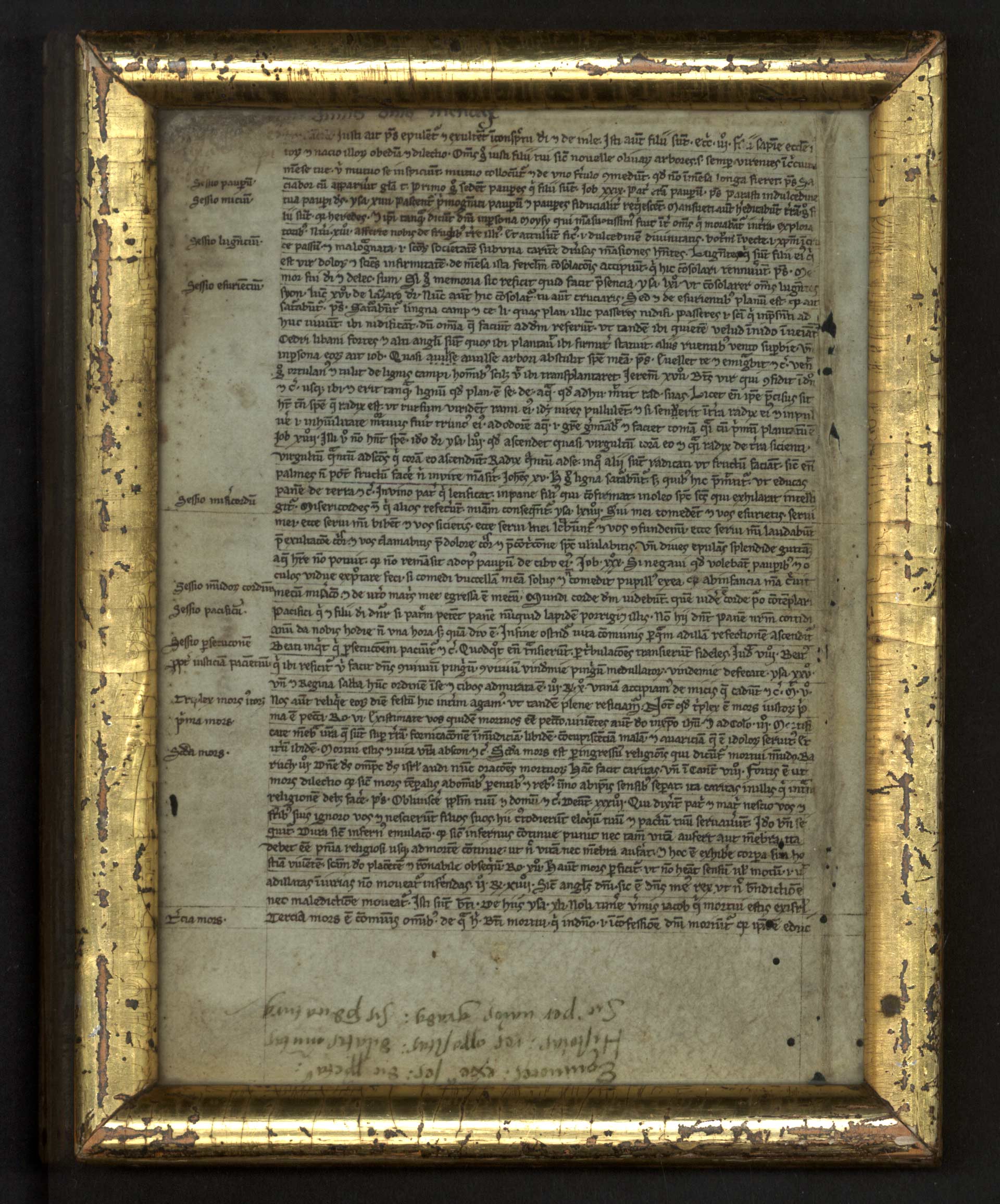 Fb-1-02) Rubní strana téhož listu je opatřena marginálními odkazy, jež upozorňují na jednotlivé pasáže ilustrované biblickými citáty. Podle těchto marginálií pojednává dochovaná strana o osmero blahoslavenstvích známých z Matoušova evangelia.