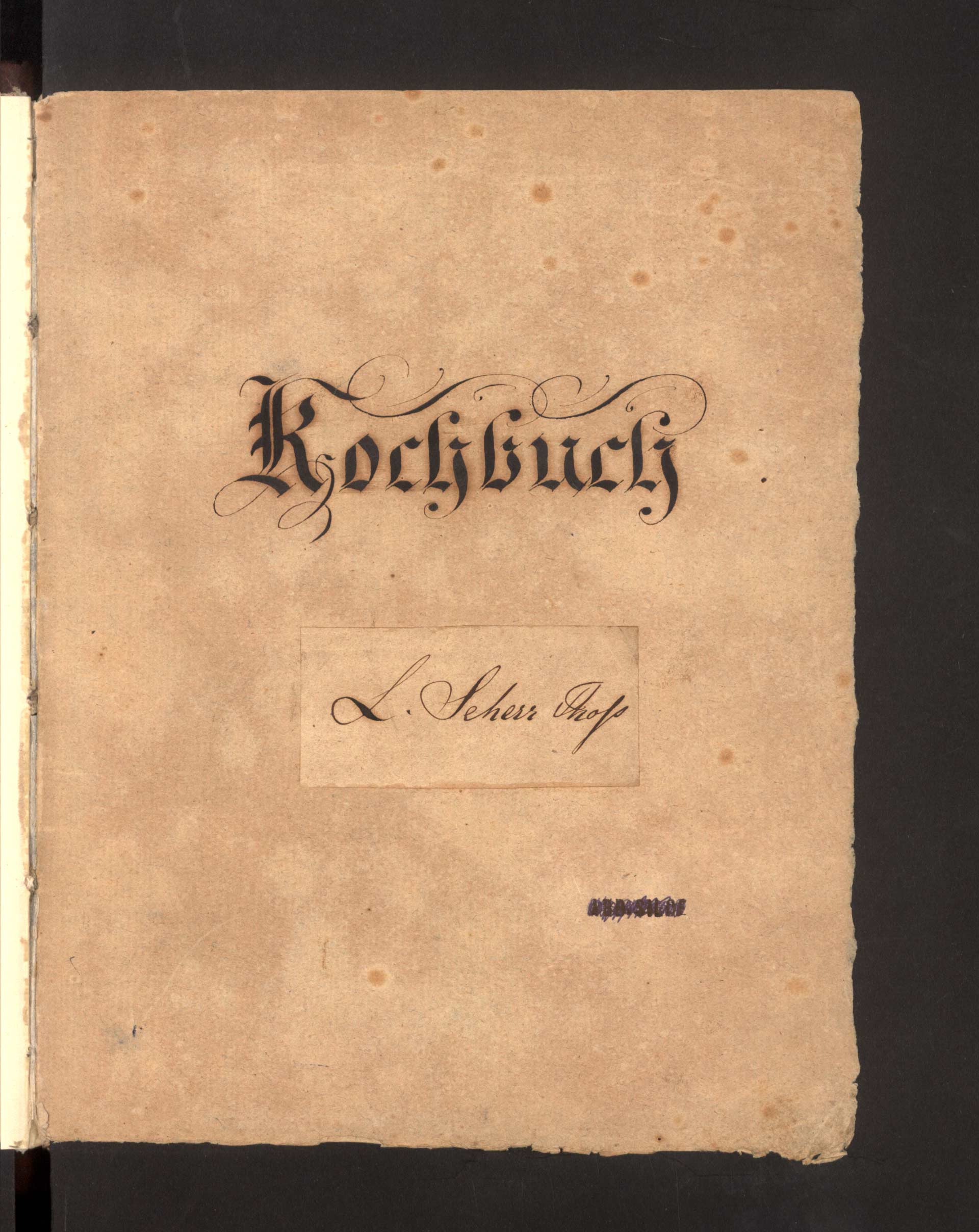 Fb-4-01) Titulní list kuchařské knihy z 19. století je opatřen později nalepeným štítkem se jménem L. Scherr, který může skrývat jméno původního vlastníka.
