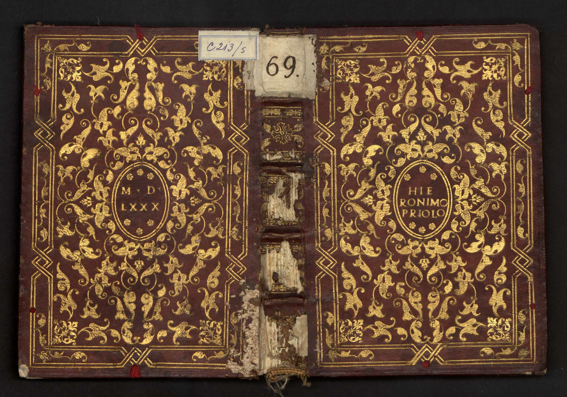 Ab-4-01) Hnědá kožená vazba je na hřbetě i obou deskách zdobena zlatým tiskem. Zatímco uprostřed přední desky je jméno vlastníka, na zadní desce nalezeme rok vzniku vazby (1580). Jedná se o luxusní vazbu pocházející z Benátek.