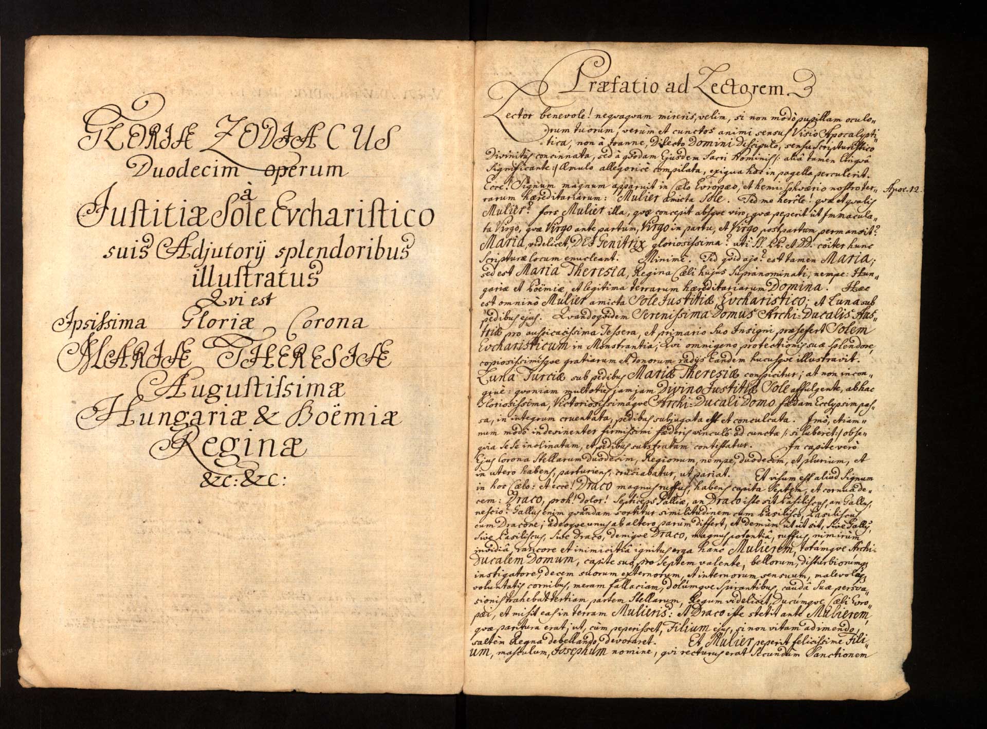 Ga-1-02) Název rukopisu a předmluva ke čtenáři je psána humanistickým písmem, přičemž se zde střídají všechny jeho základní typy: majuskula, kreslená minuskula, polokursiva i kursiva.
