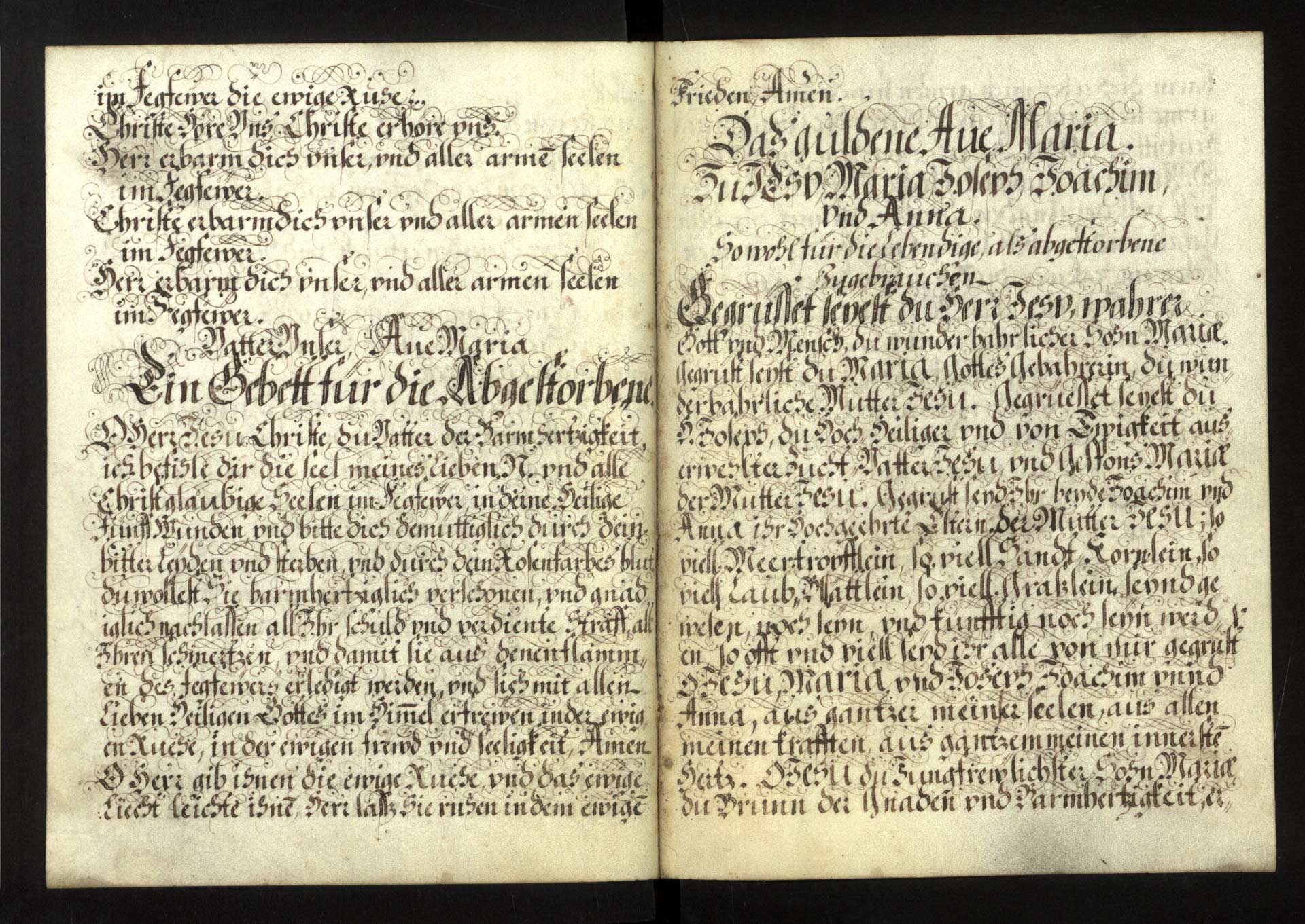Ab-5-03) Dvojlist, obsahující modlitby za zemřelé a "Zlaté Ave Maria" ke cti Ježíše, Marie, Josefa, Jáchyma a Anny, je psán kaligrafickou novogotickou kurzivou.