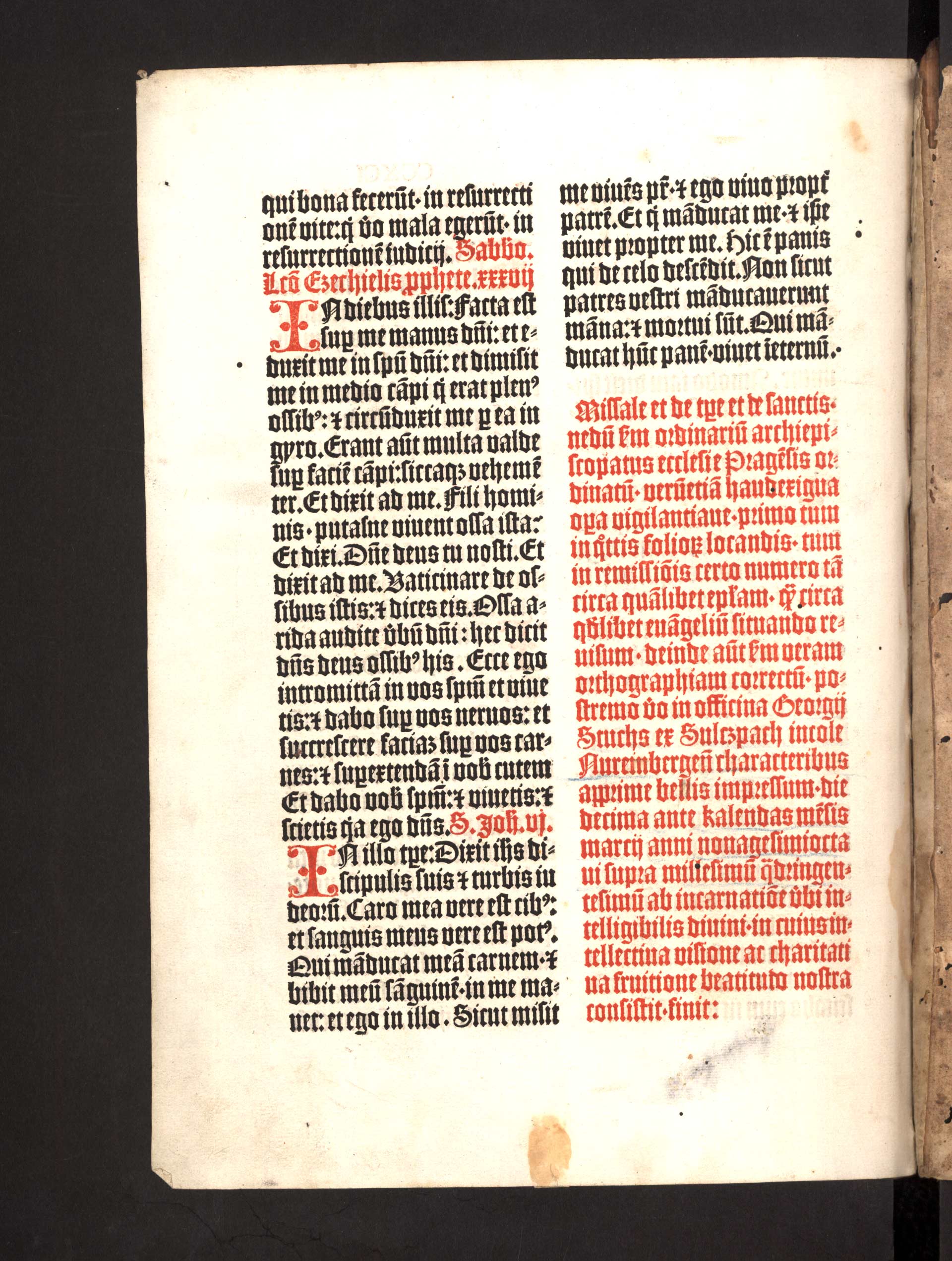 Ha-1-01) Podle tištěného kolofonu na zadní straně vydal Georg Stuchs z Norimberka tento misál pro potřeby pražské arcidiecéze v roce 1498. Misál je vybaven dvěma celostránkovými dřevořezy.