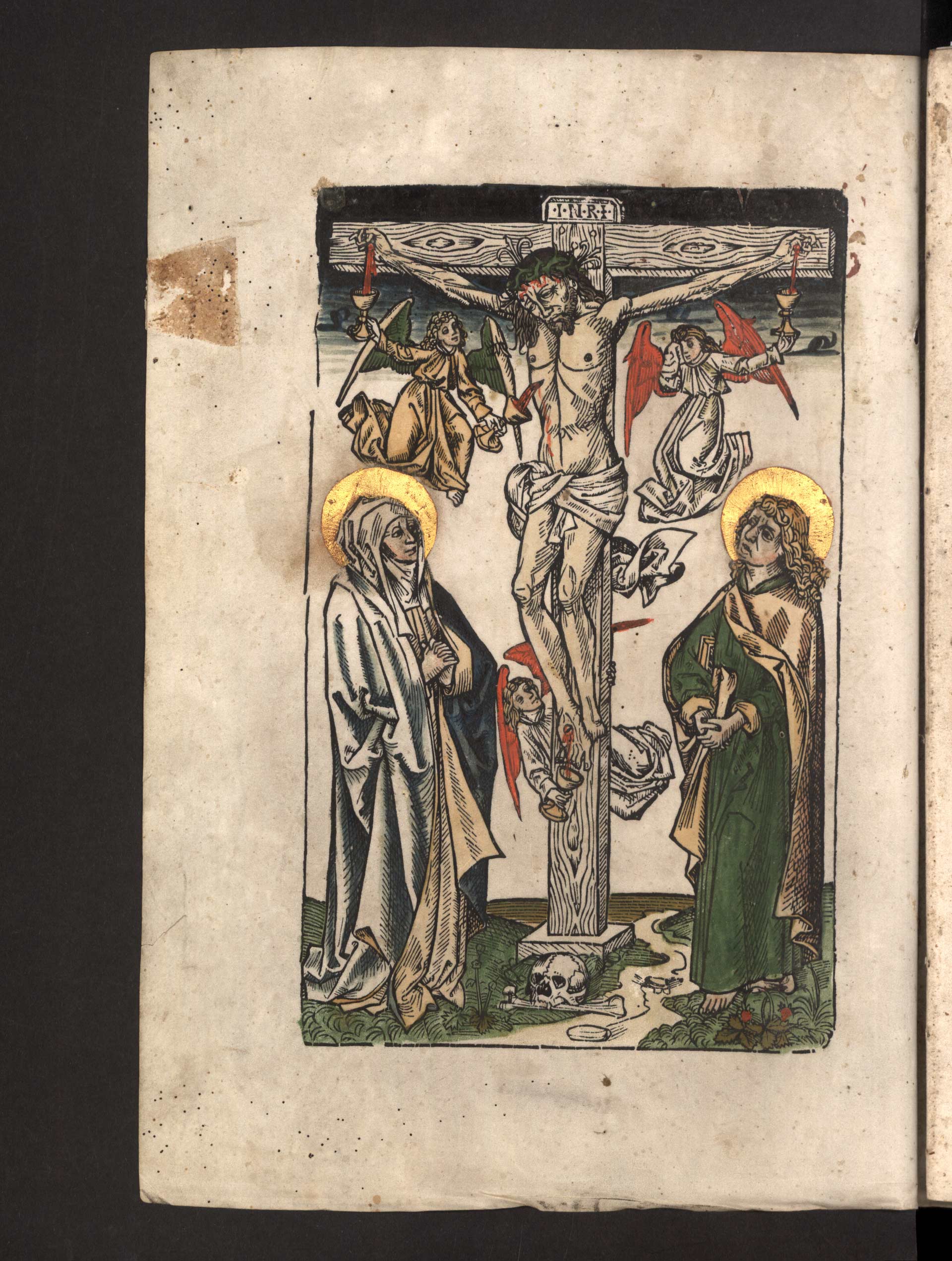 Ha-1-03) Druhým celostránkovým dřevořezem je kánonový list, který byl kolorován a zlacen. V souladu s tradicí představuje ukřižovaného Krista mezi Pannou Marií a sv. Janem obklopeného anděly, kteří zachycují jeho krev.