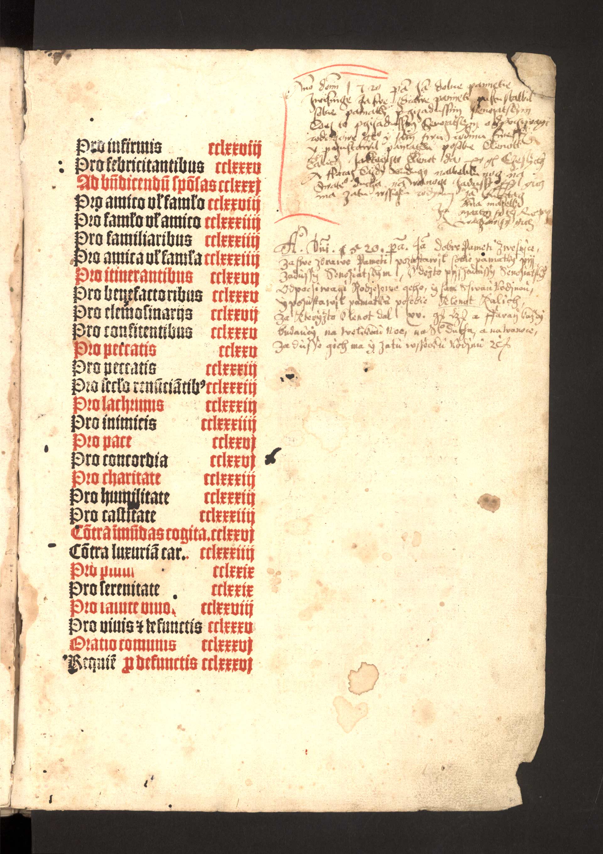 Ha-1-08) Na konci obsahu misálu byl volný prostor použit pro zápis daru mešního kalicha v ceně 15 grošů českých, který Jan z Vesnice roku 1520 věnoval záduší v Senožatech. Za to si vymínil, že za něj a jeho příbuzné budou každý rok slouženy mše na Velikonoce, Letnice a Vánoce.