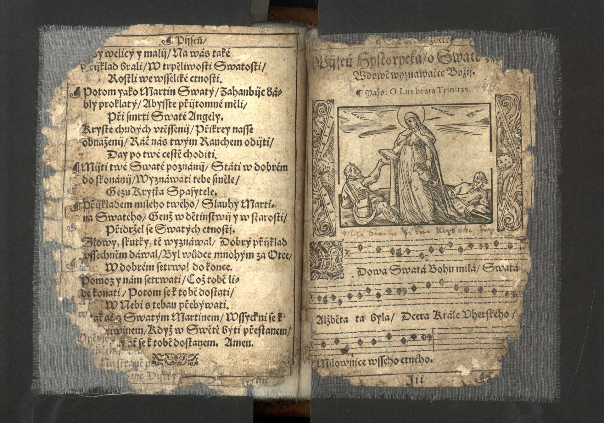 Ha-3-04) Stejně jako předchozí písně i tato o svaté Alžbětě je ilustrována obrazem světice, konající milosrdné skutky. Chorální notace pod dřevořezem je provedena technikou typografického nototisku a texty jsou tištěny švabachem.