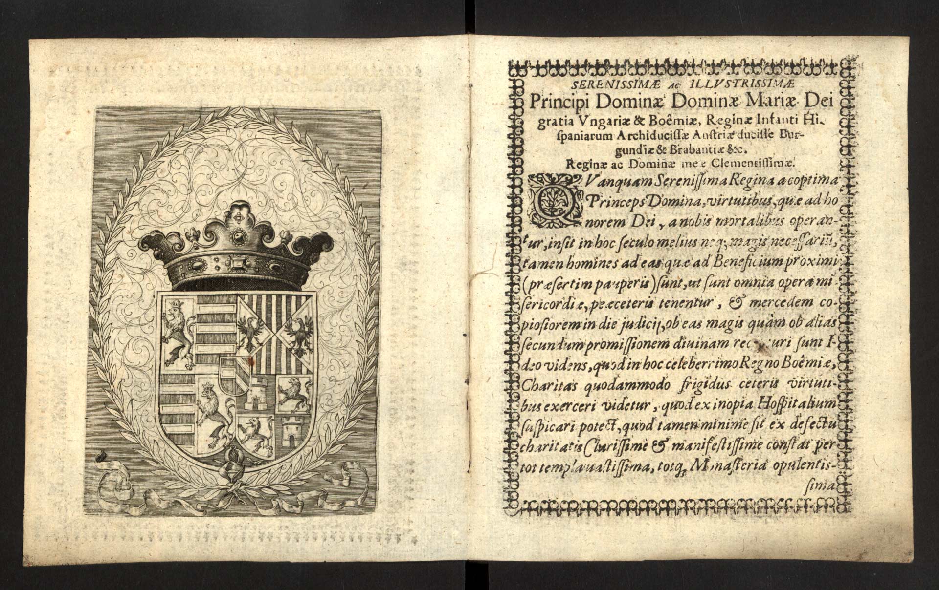 Hb-1-02) Kniha je věnována manželce římského císaře a českého krále Ferdinanda III. Marii Anně Španělské, jejíž erb, provedený technikou mědirytiny, celou dedikaci uvozuje.