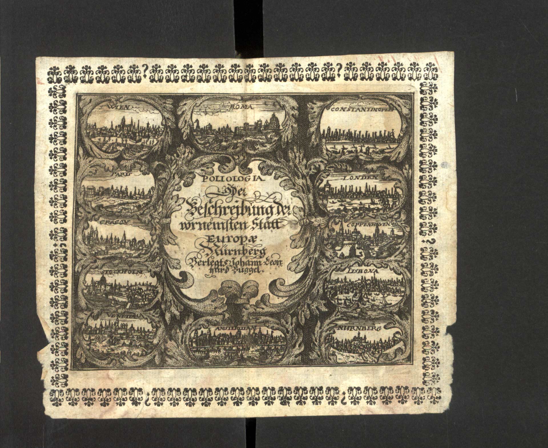 Hb-2-01) Grafický titulní list, provedený technikou mědirytiny, uvozuje popis významných měst, pevností, klášterů, zámků a dalších lokalit po celé Evropě. V souladu s tímto programem titulní list představuje drobné veduty hlavních měst Evropy. V kartuši na levé straně se jedná o: Vídeň, Paříž, Krakov, Stockholm a Benátky, sloupec vpravo představuje: Konstantinopol, Londýn, Kodaň, Lisabon a Norimberk. Nad titulem díla je veduta Říma a pod ní Amsterodam. Celá mědirytina je lemována bordurou z tiskařských ozdůbek.