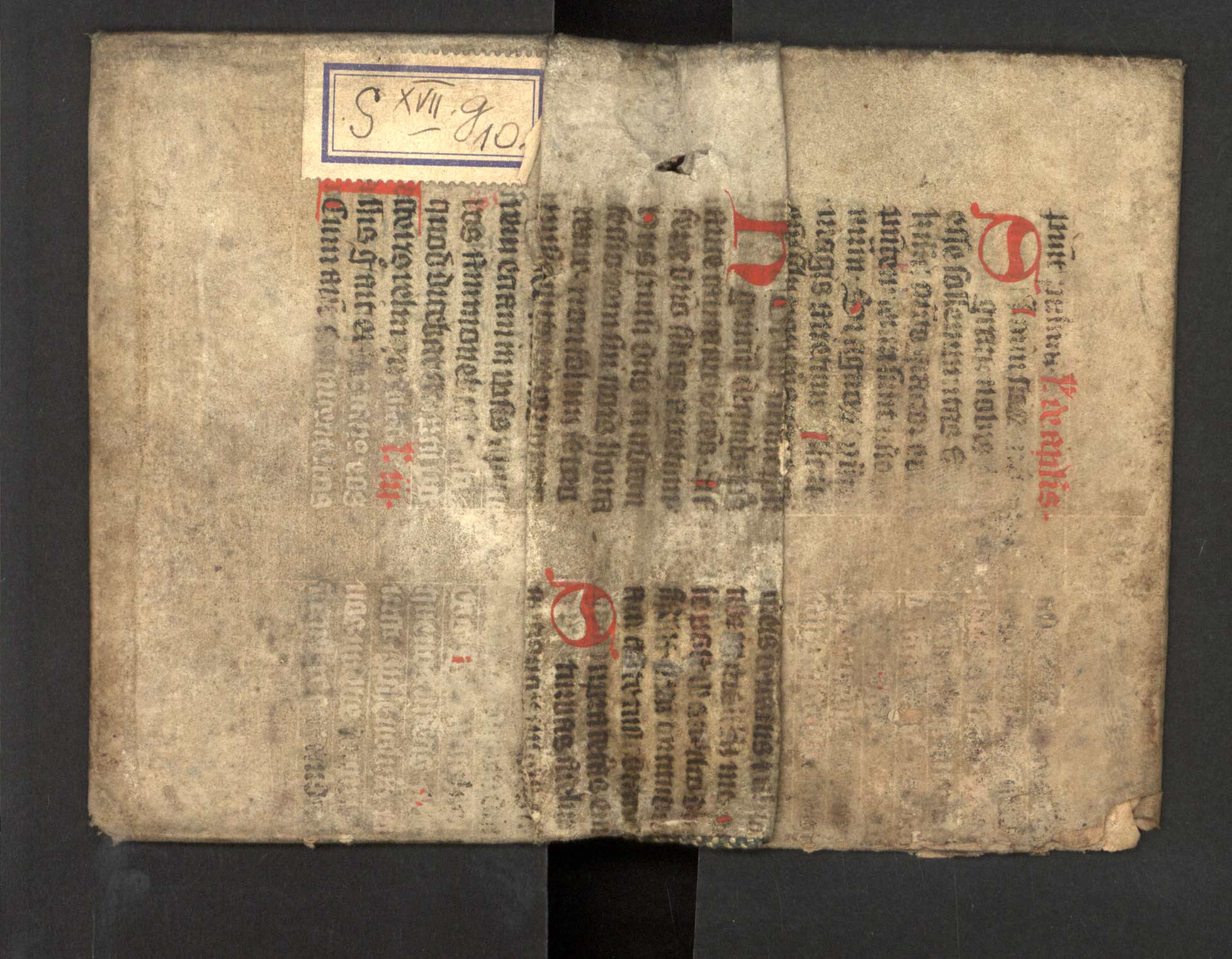 Hb-2-04) Kniha je svázána v sekundárně použitém pergamenu, popsaném liturgickými texty gotickou minuskulou.