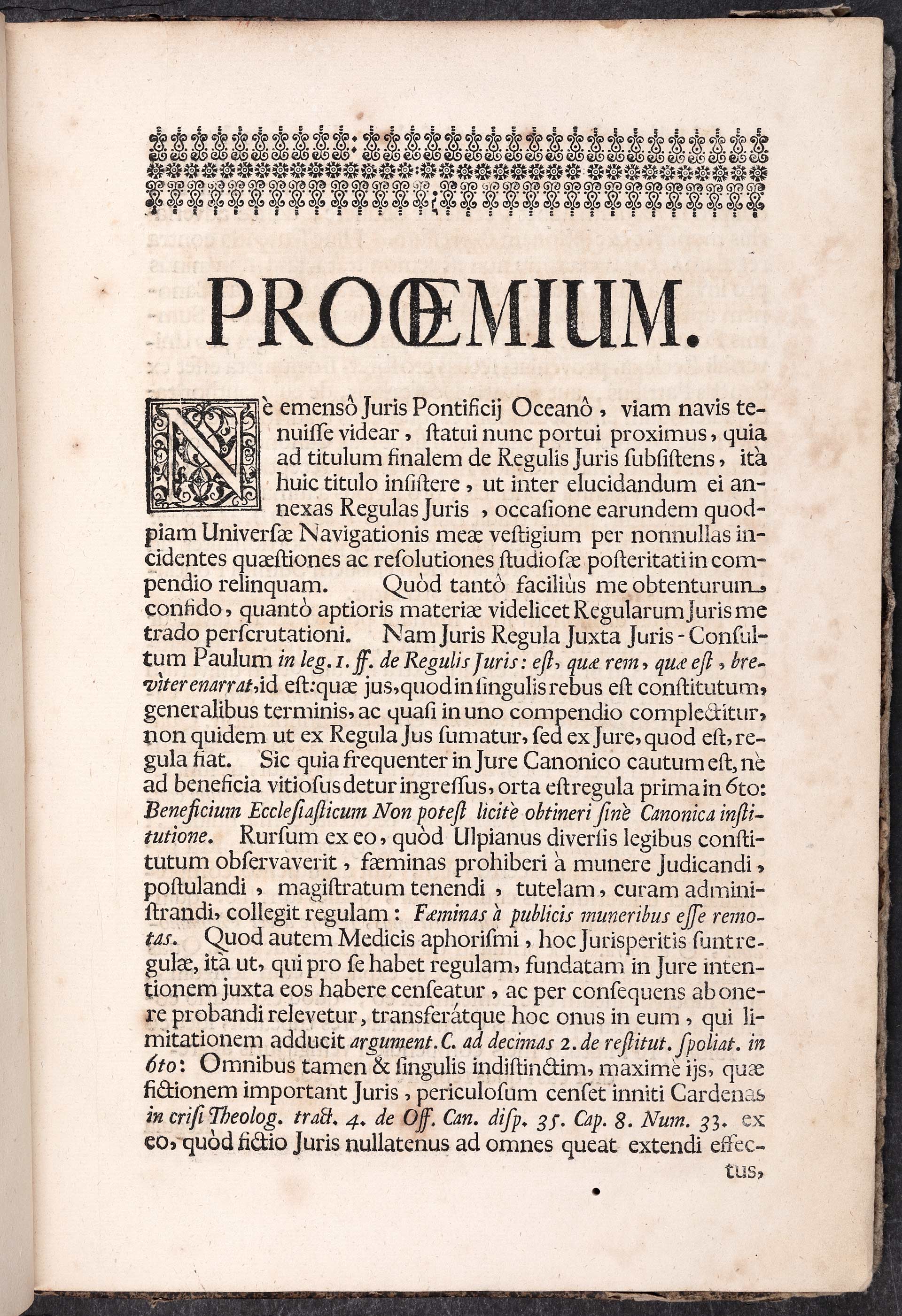 Hb-3-03) Předmluva k textu z církevního práva je uvozena vlysem z tiskařských ozdůbek a dřevořezovou iniciálou.
