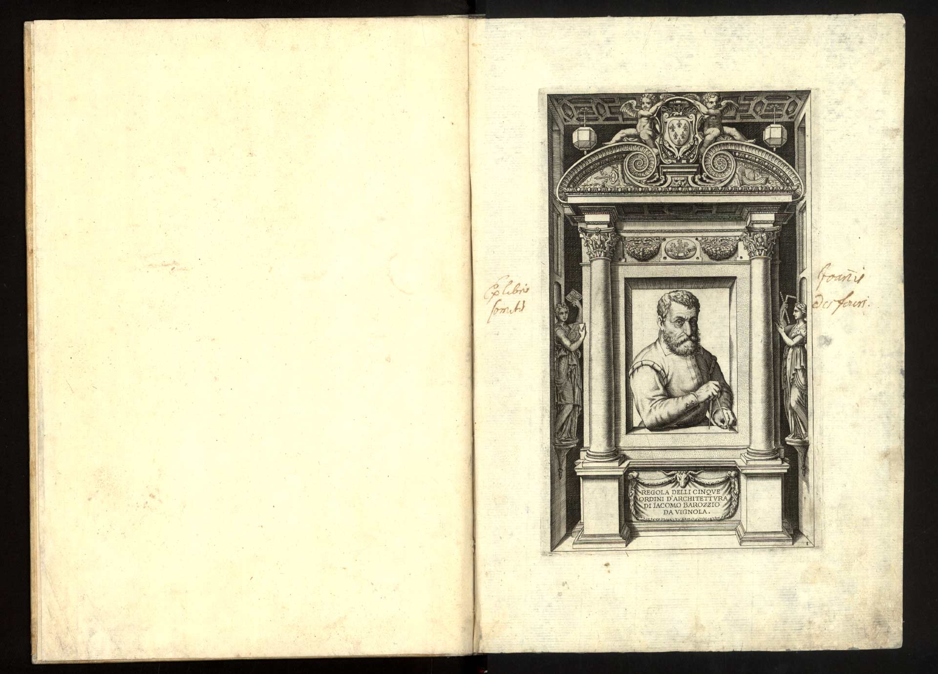Hb-4-01) Grafický titulní list, provedený technikou mědirytiny, předznamenává pojednání o díle významného italského architekta, jímž byl Jacopo Barozzi da Vignola (1507-1573). Alegorické figury, držící geometrické nástroje a nákresy, lemují architekturu s portrétem umělce.