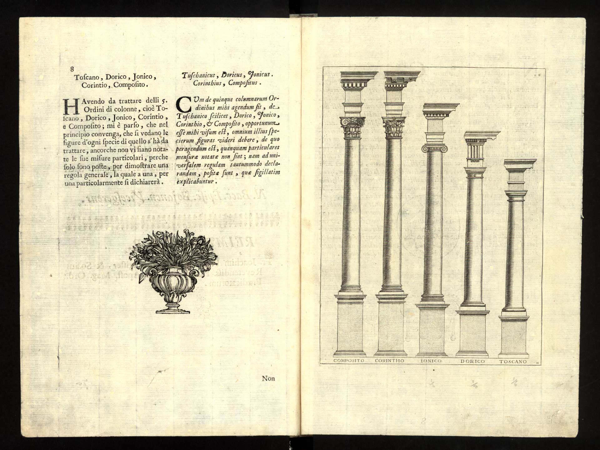 Hb-4-03) Text, tištěný italsky (antikvou) a latinsky (italikou), je doplněn dřevořezovou vinětou a mědirytinou představující sloupy provedené v kompozitním, korintském, iónském, dórském a toskánském slohu.
