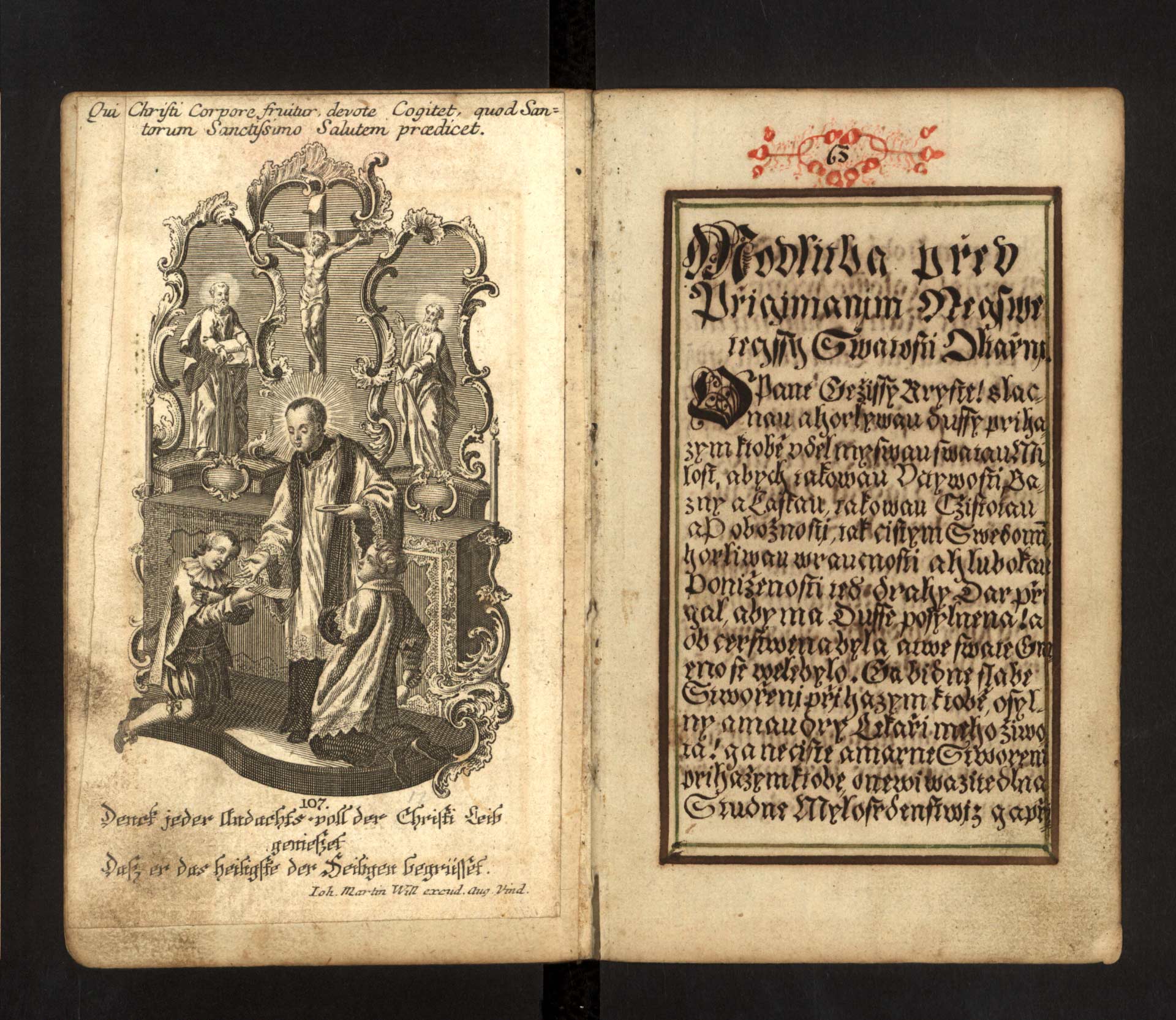 Hb-5-04) Grafika z dílny Johanna Martina Willa, povzbuzující k zbožnému přijímání Nejsvětější svátosti oltářní uvozuje modlitbu, kterou se věřící měli při této příležitosti modlit.