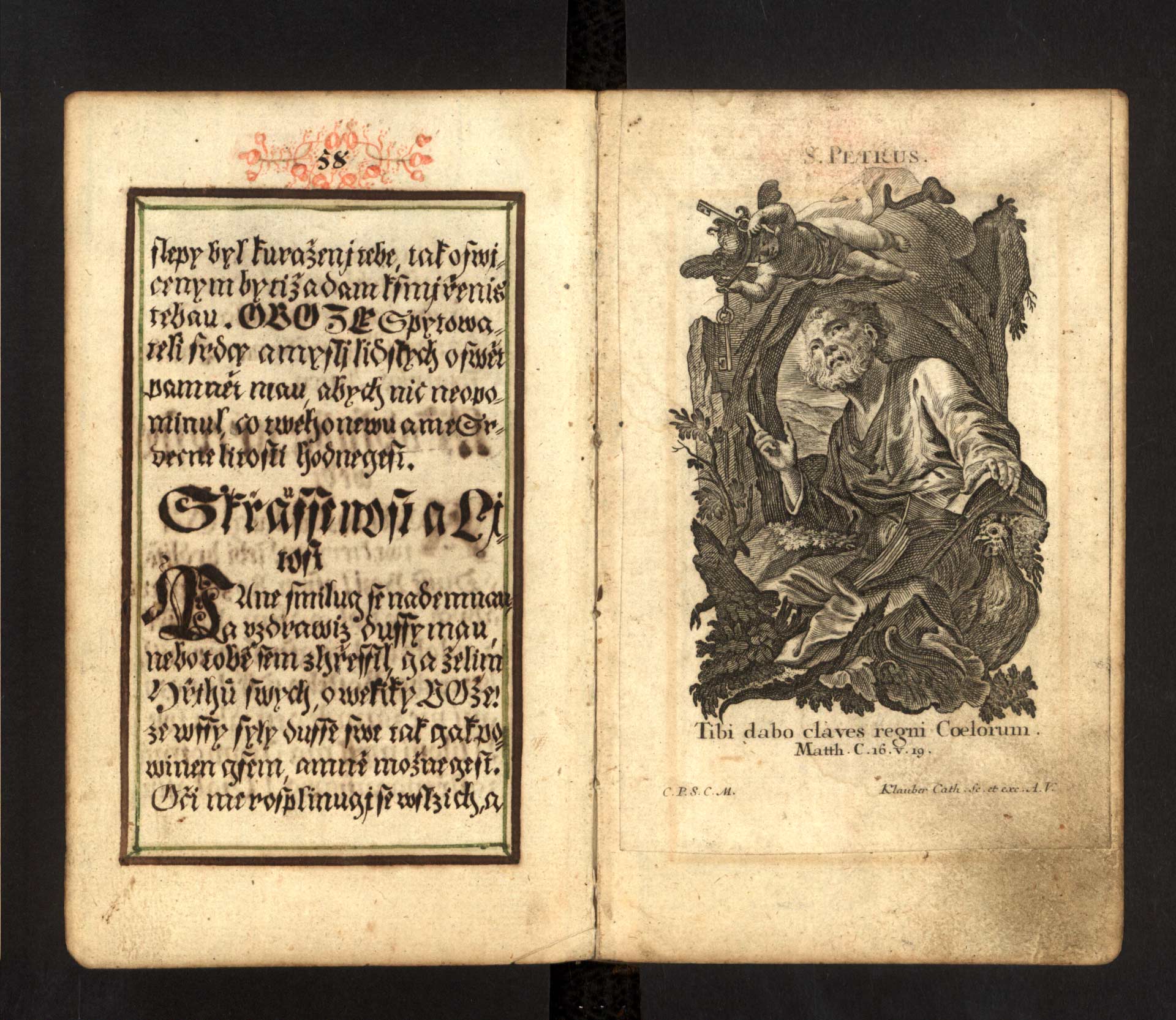 Hb-5-08) Grafika z Klauberovy dílny představuje sv. apoštola Petra, kterému jsou andělem předávány klíče od Království nebeského.