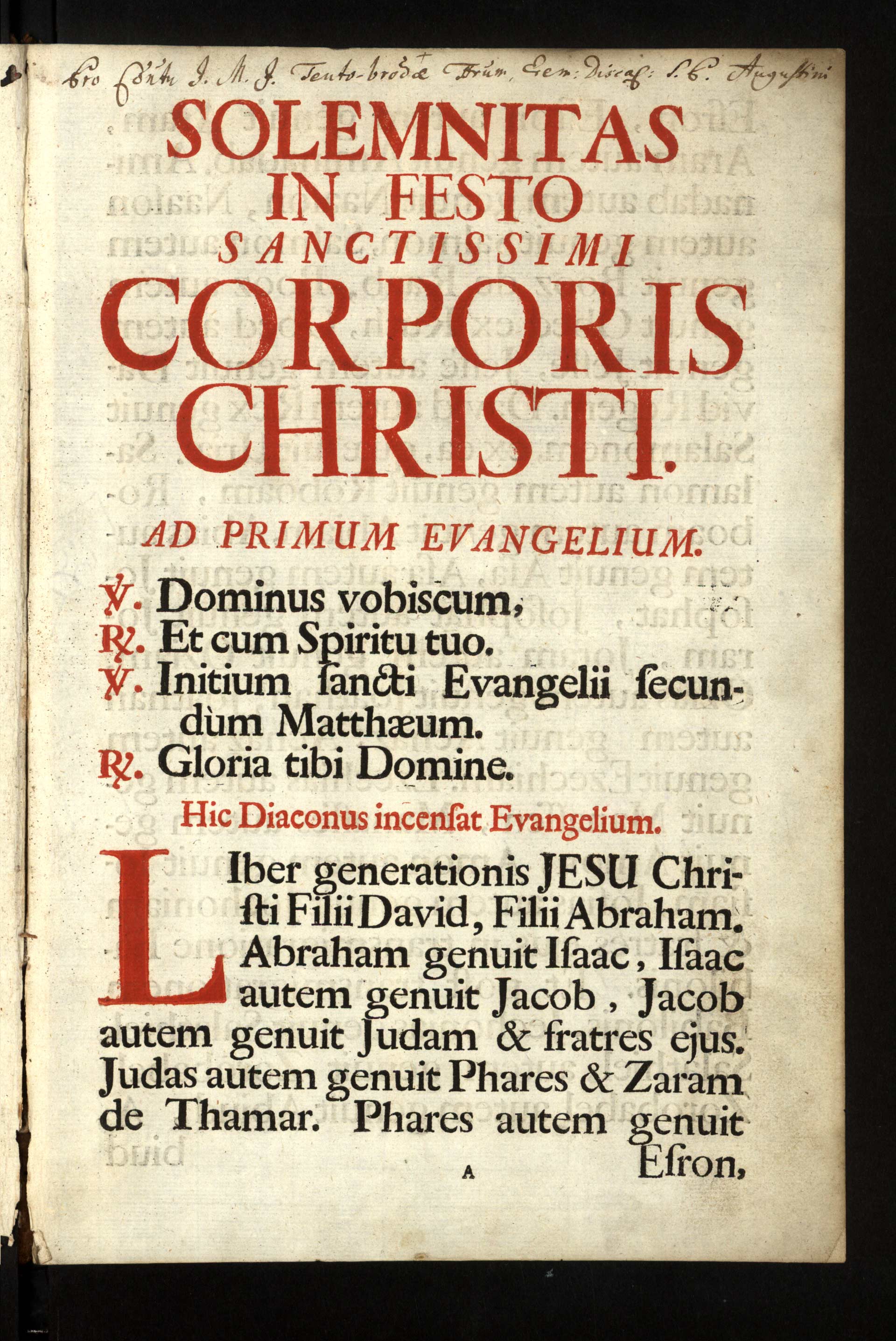 Ac-1-03) Svazek obsahuje tištěné dodatky k misálu. Ručně psaná poznámka v záhlaví strany pak signalizuje, že kniha byla pořízena a svázana pro klášter bosých augustiniánů v Německém (dnes Havlíčkově) Brodě.