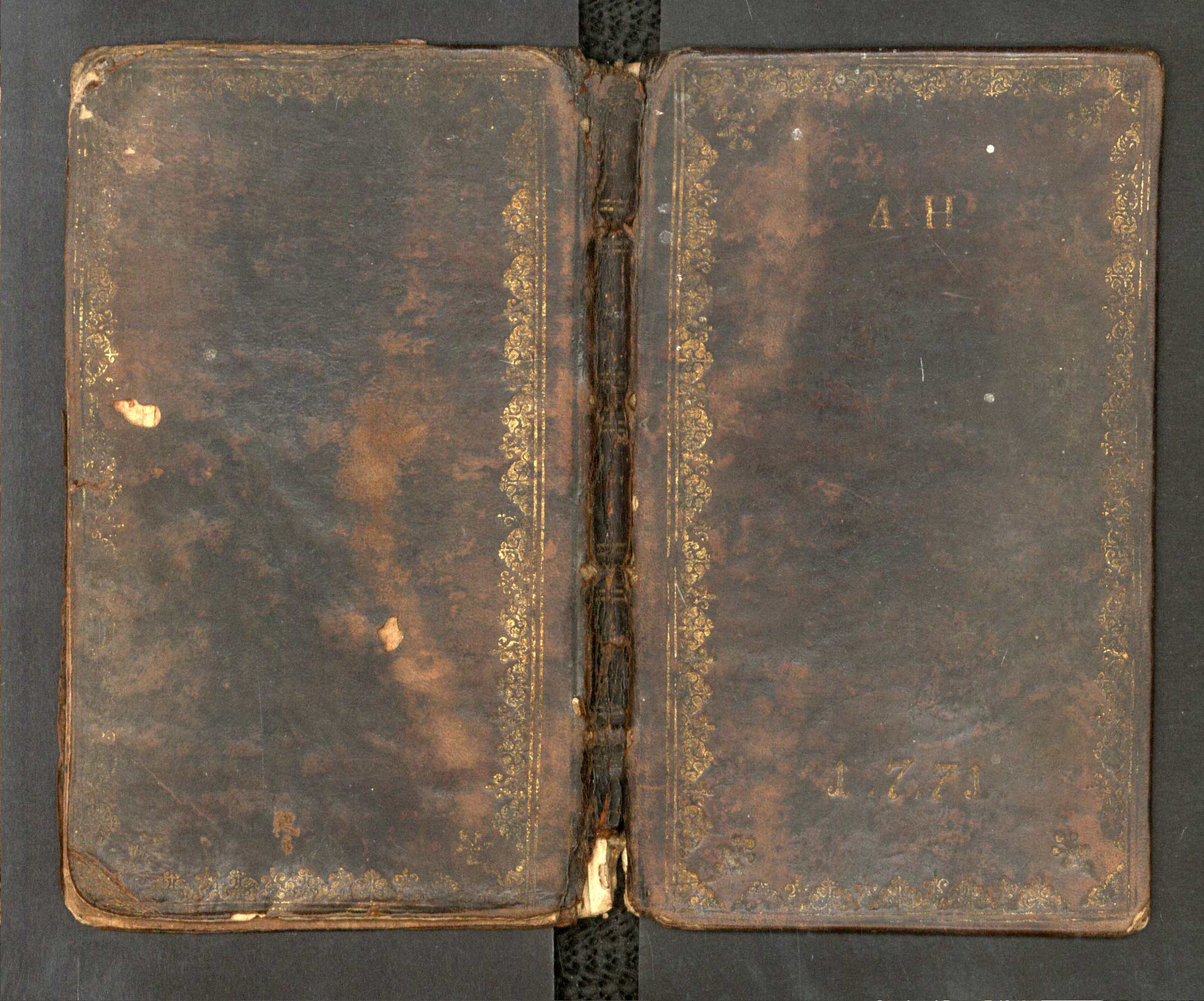 Hb-5-11) Kniha je opatřena hnědou koženou vazbou se zlatotiskovou bordurou. Na přední desce se nachází supralibros v podobě monogramu "A. H." doplněné letopočtem "1771".