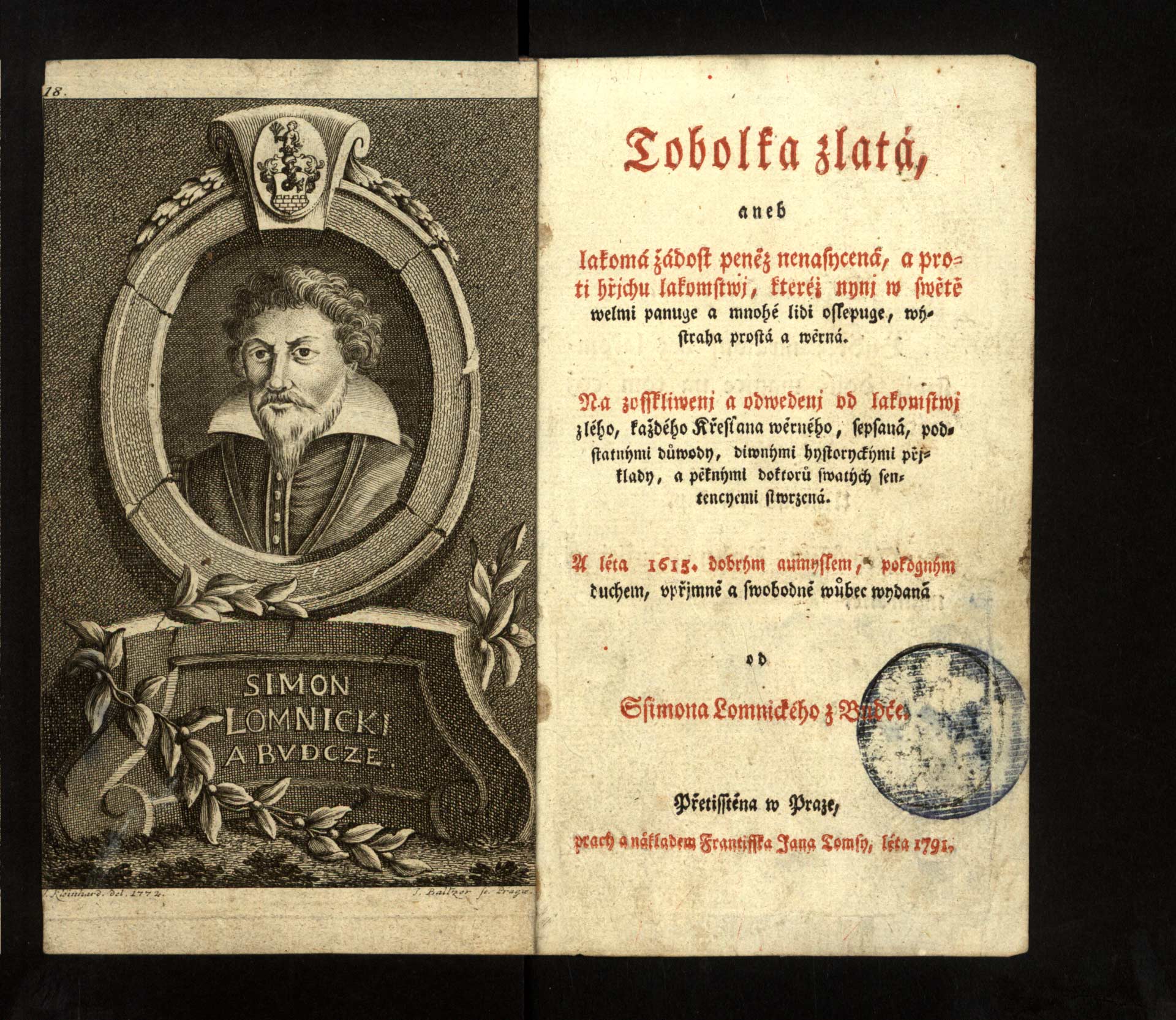 Hb-6-01) Dílo Šimona Lomnického z Budče nazvané "Tobolka zlatá" bylo poprvé vydáno roku 1615. Pražský přetisk z roku 1791 je doplněn mědirytinovým frontispisem s portrétem autora. Podle signatur je autorem předlohy z roku 1772 J. Kleinhard, rytcem pak J. Baltzer.