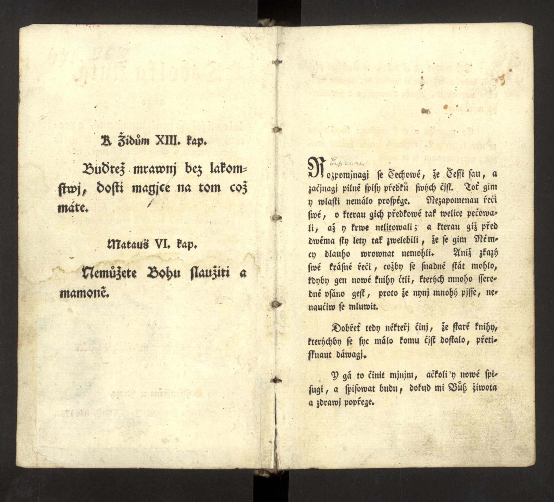 Hb-6-02) Kniha je tištěna převážně frakturou, pouze citáty na levé straně švabachem.