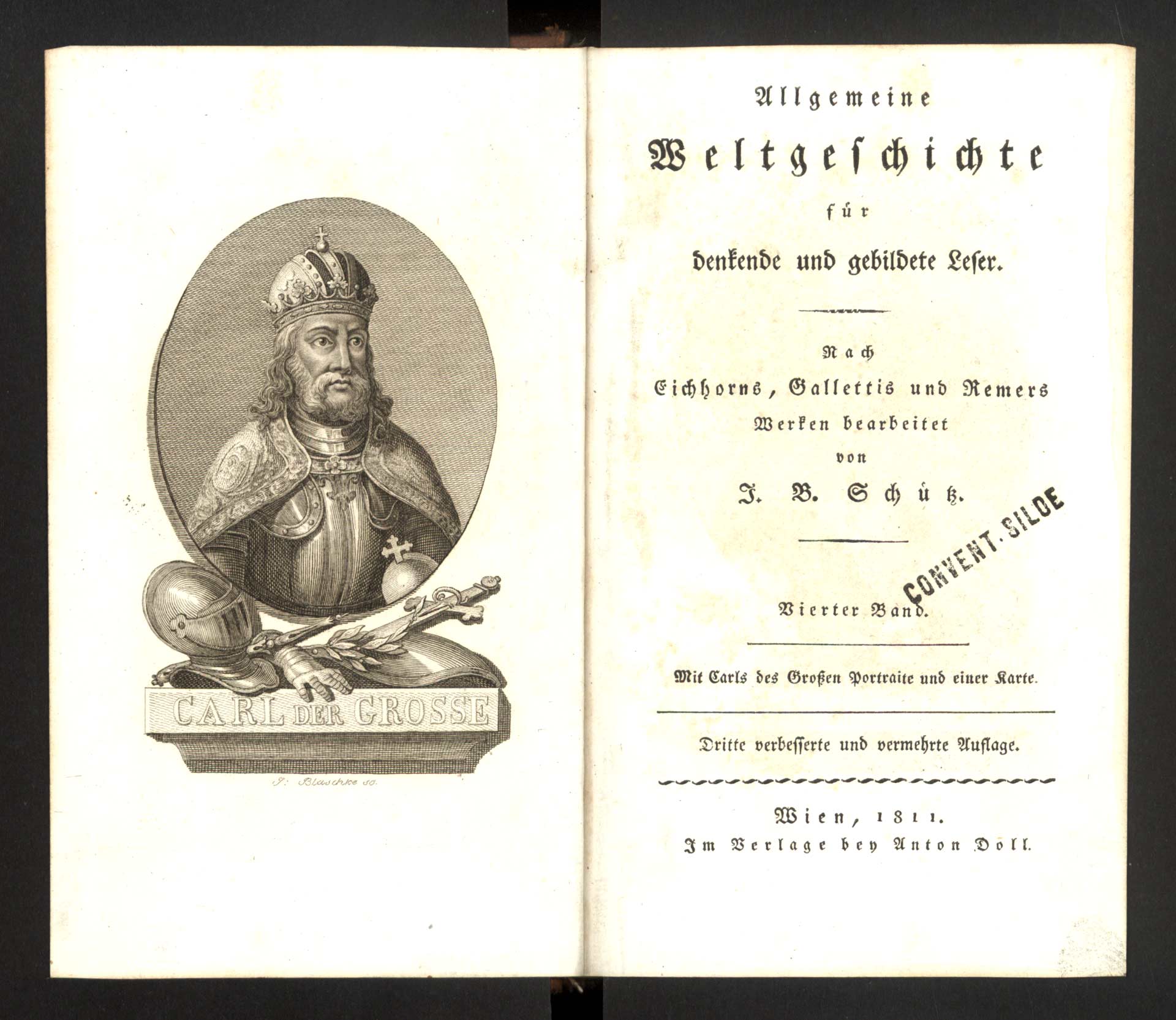 Hb-7-01) Čtvrtý svazek světových dějin pro přemýšlivého a vzdělaného čtenáře od J. B. Schütze je opatřen frontispisem představujícím Karla Velikého. Autorem mědirytiny je podle signatury J. Blaschke.